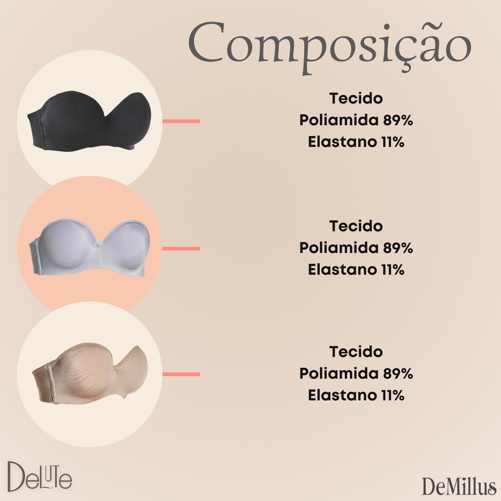 Sutiã Tomara Que Caia Bustiê Demillus Ref: 67858 Sutiã Bustiê Vertigem DeMillus em microfibra elástica, com taças em espuma moldada para um ajuste perfeito e confortável. Possui aro para maior suporte e barbatanas nas laterais, garantindo firmeza. As costas duplas, com elástico largo interno, oferecem mais sustentação, enquanto os colchetes proporcionam 4 opções de regulagem para um ajuste personalizado. Não inclui alças e não é compatível com o uso delas. Para um ajuste ideal em costas mais largas, recomenda-se o uso do Extensor Triplo. - Bojo moldado. - Barbatanas laterais. - Colchetes com 4 opções de regulagem. - Não inclui alças e não se adapta ao uso das mesmas. Composição: Tecido: Poliamida 89% e Elastano 11% Bojo: Poliéster 100% Forro Lateral: Poliamida 75% e Elastano 25%