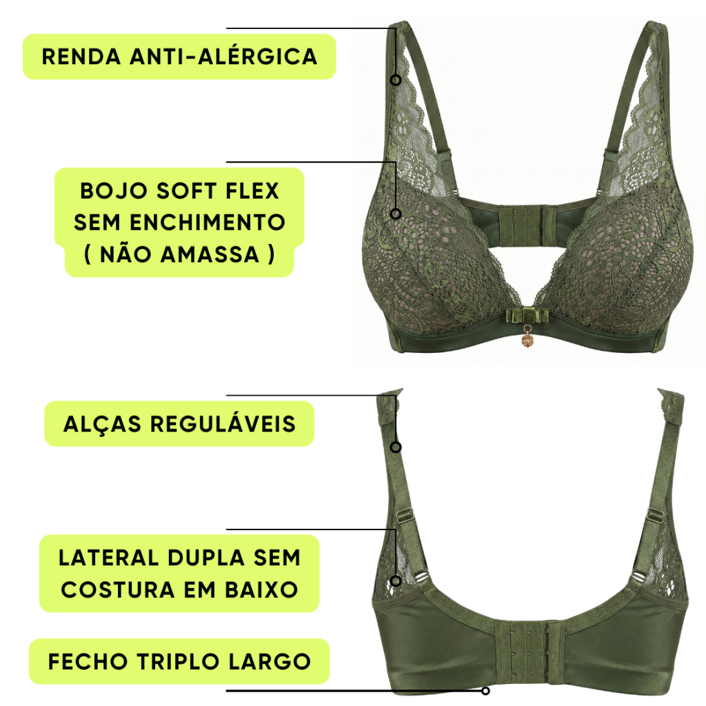 Descubra o equilíbrio perfeito entre sofisticação e bem-estar com este Sutiã de Renda Premium. Desenvolvido para mulheres que não abrem mão da estética, mas exigem conforto absoluto no dia a dia, esta peça redefine a experiência de usar lingerie. A estrutura conta com a tecnologia exclusiva de Bojo Soft, uma espuma de memória inteligente que se adapta ao formato dos seios sem adicionar volume artificial. Sua grande vantagem é a alta durabilidade: é um bojo que não quebra, não amassa e não deforma, mesmo após lavagens ou ao ser dobrado na gaveta, garantindo que a peça mantenha a aparência de nova por muito mais tempo. Confeccionado em poliamida de alta qualidade, o tecido oferece um toque gelado e sedoso, permitindo que a pele respire e evitando a transpiração excessiva. O acabamento em renda antialérgica foi pensado especialmente para peles sensíveis, proporcionando um visual delicado sem causar coceira ou irritações. Nas costas, o fecho triplo reforçado oferece sustentação superior e ajuste personalizado, adaptando-se perfeitamente a diferentes larguras de tórax. --- Principais Benefícios Tecnologia Bojo Soft Indestrutível: Material flexível que pode ser dobrado e lavado sem perder o formato original, ideal para levar em viagens sem danificar a peça. Toque Fresco e Respirável: A microfibra de poliamida proporciona sensação térmica agradável, ideal para dias quentes, diferentemente de tecidos sintéticos comuns. Renda Antialérgica: Toque extremamente macio que não pinica, garantindo conforto total mesmo após horas de uso. Ajuste Anatômico Seguro: O fecho traseiro com tripla regulagem e as alças ajustáveis permitem a customização perfeita da compressão e sustentação. Detalhes de Luxo: Acabamento acetinado na base e pingente banhado a ouro que agregam valor e sofisticação à peça. --- Perguntas Frequentes (FAQ) O bojo deste sutiã deforma na máquina de lavar? Não. Este modelo utiliza a tecnologia Bojo Soft, que é ultra flexível e projetada para não quebrar ou criar vincos permanentes, mantendo a estrutura original da peça por muito mais tempo. O tecido esquenta ou incomoda no calor? Não. O sutiã é feito predominantemente em poliamida, uma fibra nobre conhecida por seu toque frio e alta respirabilidade, que evita o acúmulo de suor. A renda causa coceira ou irritação na pele? Não. Utilizamos exclusivamente renda com tratamento antialérgico e toque aveludado, desenvolvida para ser suave até mesmo nas peles mais sensíveis. O sutiã possui boa sustentação nas costas? Sim. Diferente de modelos básicos, este sutiã possui um fecho com colchetes triplos (três opções de regulagem), proporcionando maior firmeza e segurança ao vestir. Este modelo aumenta o volume dos seios? O Bojo Soft tem a função de modelar e arredondar os seios de forma natural, sem adicionar volume excessivo artificialmente, garantindo um visual elegante e discreto sob a roupa. Verrati Lingerie - Moda íntima