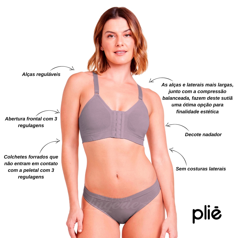Sutia Plie Control Duplo Nadador Ref: 50114 O Sutia estetico nadador e excelente para a recuperacao de um pos operatorio, pois alem de garantir sustentacao o tecido possui tratamento hidrofilo o que permite sua pele respirar livremente evitando assim irritacoes e colaborando para a cicatrizacao Caracteristicas: - As alcas e laterais mais largas, junto com a compressao balanceada, fazem deste sutia uma otima opcao para finalidade estetica. - Abertura frontal com 3 regulagens. - Decote nadador. - Colchetes forrados que nao entram em contato com a pele. - Alcas regulaveis. - Poliamida SensilR super macia. - Sem costuras laterais. - Tratamento hidrofilo, sua pele respira livremente. Composicao: 90% Poliamida 10% Elastano