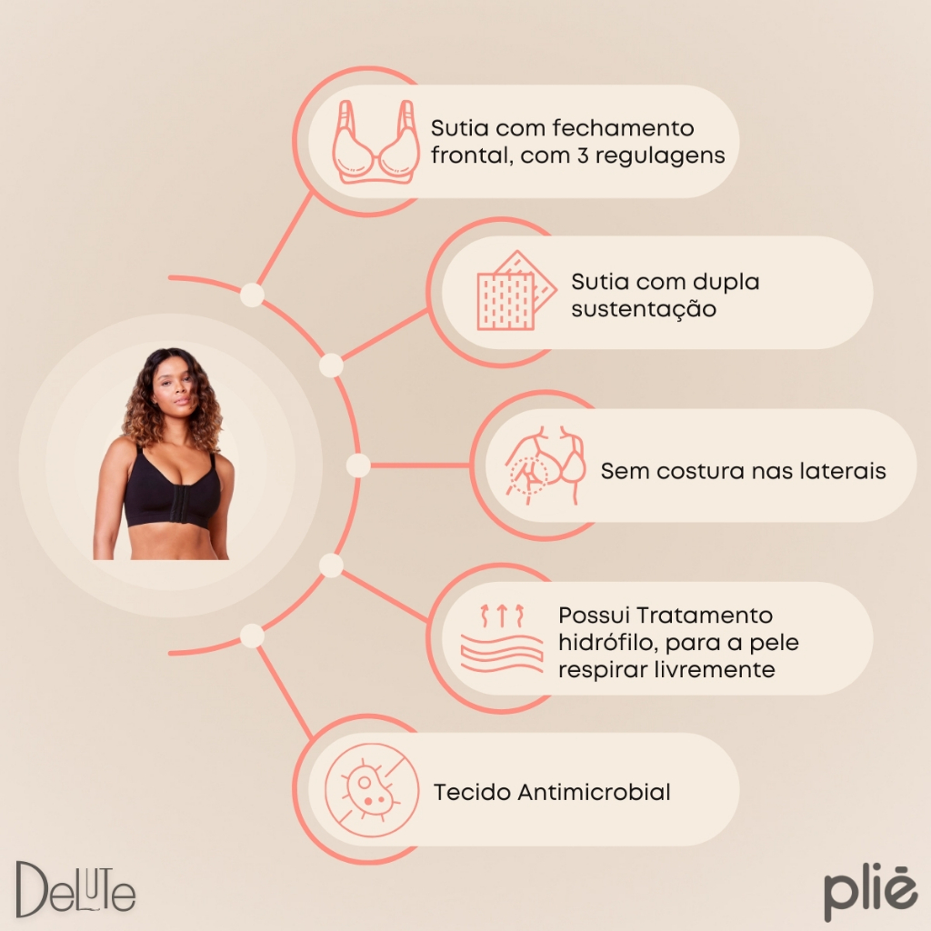 Sutiã Plié Fecho Frontal Ref: 50115 Conforto e segurança para sua recuperação pós-cirúrgica! Este sutiã foi desenvolvido para proporcionar alta sustentação e praticidade durante o pós-operatório. Seu tecido hidrófilo permite que a pele respire, prevenindo irritações e alergias, enquanto o cós duplo oferece suporte extra para seu conforto. Abertura frontal com 3 regulagens para ajuste perfeito Alças largas e ajustáveis que garantem conforto e segurança Elástico macio para maior suavidade ao vestir Tratamento hidrófilo que mantém a pele respirável Composição: 90% Poliamida 10% Elastano Tamanhos: P ao GG | Cores disponíveis sob consulta Invista na sua recuperação com qualidade e conforto. Adquira já o seu!