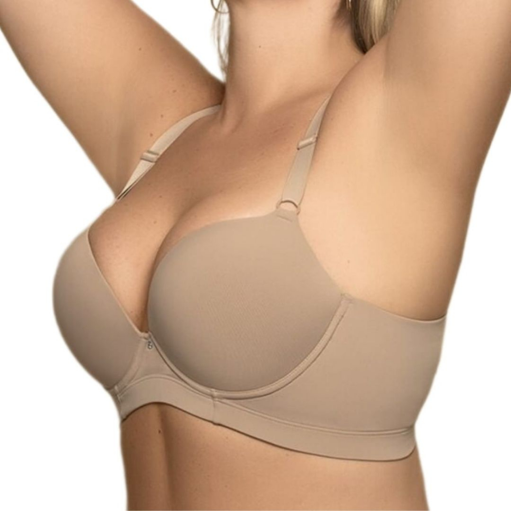 Sutiã plus size bojo liso Nayane Rodrigues Ref.: SP185 Sabe aquele sutiã MEGA custo benefício?! Você acabou de encontrar!!! Esse modelo tem bojos moldados sem enchimento e com aro, valoriza e modela os seios. As laterais são largas com tecido em microfibra bem reforçado que ajudam a alinhar a silhueta, decote em "v", com alças reforçadas que oferecem a boa sustentação e conforto para seios fartos. Fecho traseiro com triplo colchetes e tripla regulagem. **** Nenhuma opção deste modelo vem com lacinho no decote, vem com uma pedrinha, bem no centro **** Composição: 91% Poliamida 9% Elastano Forro do bojo: 100% poliéster Foro: 100% algodão