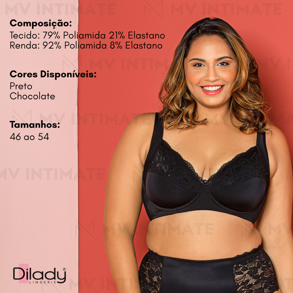 Sutiã Plus Size Com Aro Sem Bojo Dilady 123.410 - Alta Sustentação O Sutiã Plus com Aro Dilady foi criado para mulheres que buscam sustentação, conforto e definição no busto com um toque de elegância. Confeccionado em microfibra e renda elástica, seu tecido combina 79% poliamida e 21% elastano na base, além de renda com 92% poliamida e 8% elastano, proporcionando firmeza, flexibilidade e toque suave na pele. Com aro firmador, o modelo oferece suporte ideal e ajuda a modelar e definir o contorno corporal, valorizando o busto de forma natural. As alças elásticas de 24 mm proporcionam maior conforto e distribuição uniforme do peso, tornando-o perfeito para o público plus size, que busca sustentação sem abrir mão do estilo. Principais Características: -Aro firmador que oferece sustentação e modelagem do busto. -Alças elásticas de 24 mm, garantindo conforto e suporte prolongado. -Tecido duplo em microfibra e renda elástica de toque delicado. -Composição: Tecido: 79% poliamida / 21% elastano | Renda: 92% poliamida / 8% elastano -Modelagem anatômica que valoriza o corpo feminino e garante firmeza. -Ideal para uso diário, proporcionando segurança e conforto. Por que escolher este produto? -Proporciona sustentação firme e contorno definido ao busto. -Alças largas e elásticas que distribuem o peso sem desconforto. -Aro firmador que modela o seio e melhora a postura. -Combinação de microfibra e renda: equilíbrio entre funcionalidade e sofisticação. -Ideal para o público plus size, oferecendo suporte adequado e visual elegante. Se encaixa no seu estilo de vida: O Sutiã Plus com Aro Dilady é ideal para quem deseja conforto e firmeza no dia a dia ou em ocasiões que exigem segurança e suporte extra. Sua estrutura modeladora e aro firmador garantem sustentação sem desconforto, enquanto o toque delicado da renda adiciona charme e elegância à lingerie. Perfeito para usar com roupas de trabalho, eventos ou produções mais ajustadas, um essencial para mulheres que valorizam bem-estar e confiança em cada detalhe. Perguntas Frequentes (FAQs): Este sutiã tem bojo? Não possui bojo tradicional, mas conta com aro firmador que oferece formato natural e sustentação. As alças são ajustáveis? Sim. As alças elásticas de 24 mm são totalmente reguláveis e proporcionam conforto ao longo do dia. É indicado para seios grandes? Sim. O modelo foi desenvolvido especialmente para busto volumoso, oferecendo firmeza e segurança. O tecido é confortável? Sim. A combinação de microfibra e renda elástica garante toque suave e respirabilidade. Posso usar no dia a dia? Sim. É ideal para uso diário, com sustentação leve e caimento natural sob a roupa. Como cuidar da peça? Lavar à mão com sabão neutro, sem torcer, e secar à sombra. Evite alvejantes e secadora.
