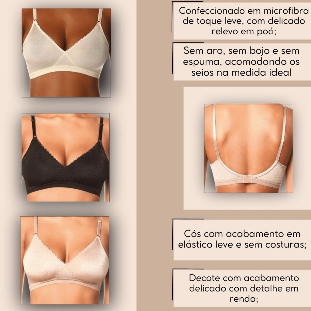 Sutiã Demillus Poás, confeccionado em microfibra de toque leve e suave, oferece máximo conforto e liberdade ao longo do dia. Sem aro, bojo ou espuma, é perfeito para quem prefere um caimento natural e discreto. O cós possui acabamento leve e sem costuras, proporcionando um ajuste que não marca a pele. Com um decote delicado, o sutiã é valorizado por um detalhe em renda, adicionando um toque de feminilidade e sofisticação à peça. Ideal para quem busca conforto e elegância no dia a dia. Composição: 82% Poliamida e 18% Elastano.