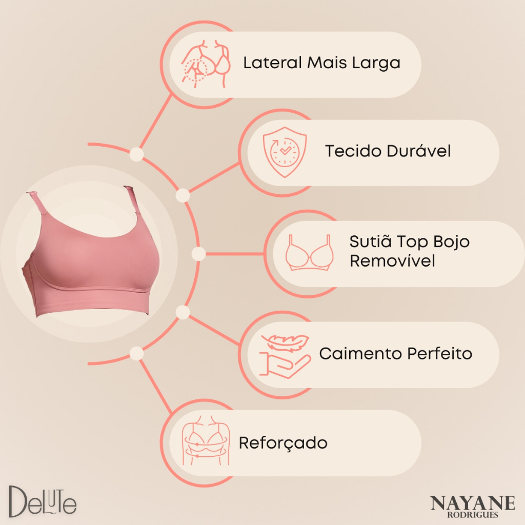 Sutiã Top com Bojo Removível Nayane Rodrigues Base Dupla Alças Ajustáveis Lateral Reforçada Fitness