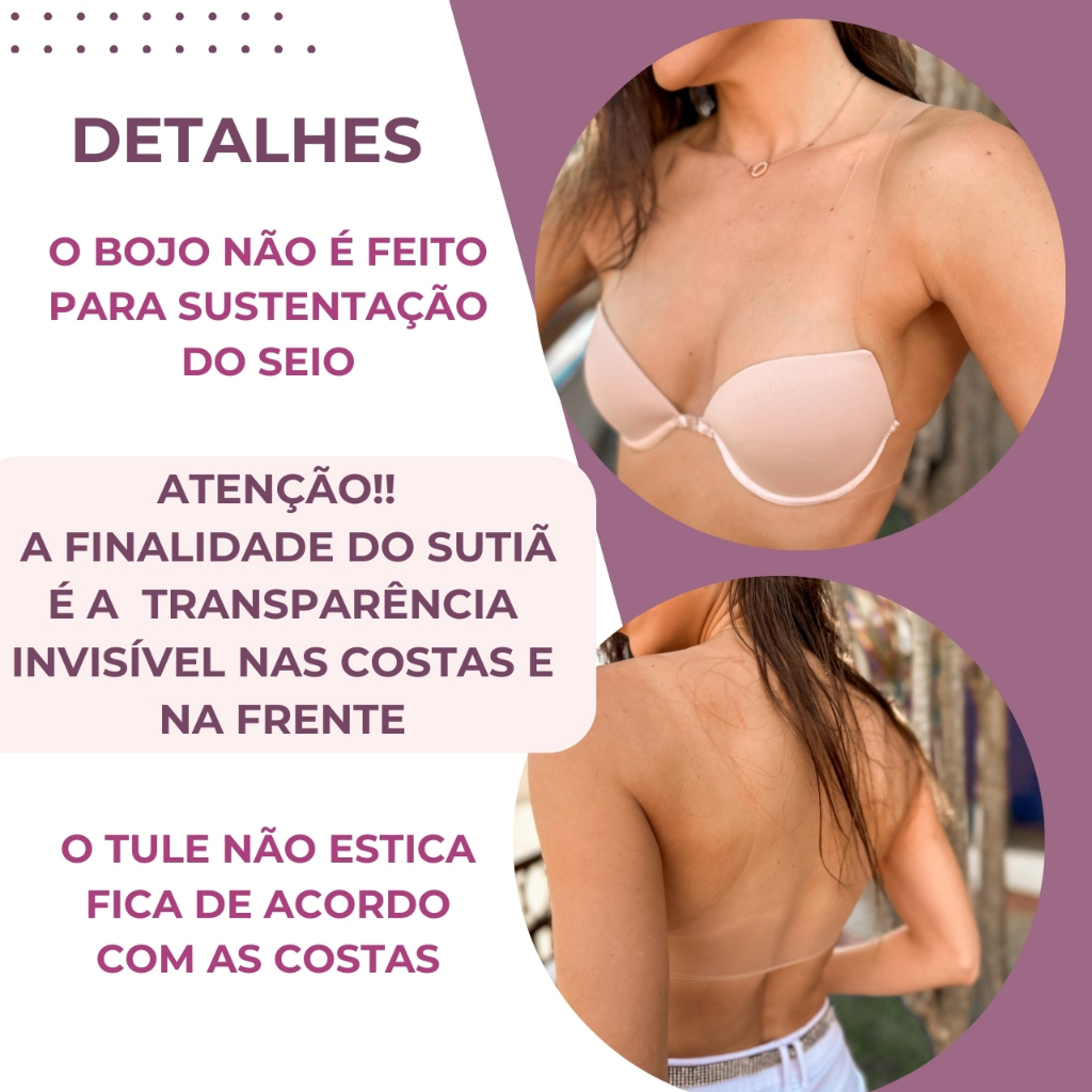 Sutian Tule Illusion com Transparência Conjunto Em Sutiã Para Usar Vestido Calcinha Sutia Cos Vazado Costas abertas. Esse conjunto de lingerie em tule é mais do que uma peça íntima — é um cuidado silencioso com cada detalhe do seu momento. Perfeito para noivas, madrinhas, formandas ou para mulheres que amam vestir roupas com costas abertas, ele foi criado para ser discreto no visual e marcante na experiência. O sutiã tem bojo e aro suave (não atua na sustentação), mas entrega o que nenhuma outra peça oferece: a invisibilidade nas costas com conforto e beleza. O tule é resistente, mas tão delicado que some na pele, criando um visual limpo, sofisticado e feminino. A abertura frontal facilita na hora de vestir, valorizando ainda mais a praticidade sem perder o charme. Acompanha calcinha combinando, para você se sentir completa — por dentro e por fora. ✨ Dica de prova: Experimente posicionar a peça sobre o corpo com cuidado. Isso permite sentir o caimento sem comprometer a integridade do produto — lembre-se que etiqueta removida caracteriza uso. 🧼 Dica de cuidado: Lave à mão com sabão neutro e água fria. Não torça, não esfregue. 📦 Se precisar trocar ou devolver: A peça deve estar sem sinais de uso, com a etiqueta original e dentro da mesma caixinha em que chegou. Assim, garantimos que ela permaneça intacta. Conteúdo do Pacote 1 Sutiã em Tule 1 Calcinha 1 Embalagem Discreta Qual o Tamanho? P (38-40) M (42) G (44) GG (46-48) EXG ( 50) Qual as Cores? Base (Nude) Preto Branco Especificações 85% Poliamida 15% Elastano Bojo: 60% Poliuretano / 40% Poliester Qual a Qualidade do Conjunto ? Nossas peças são diretamente do fabricante com alta durabilidade do tecido e do produto se conservado poderá durar por anos. Os acessórios são banhados em ouro. Peças antialérgicas.