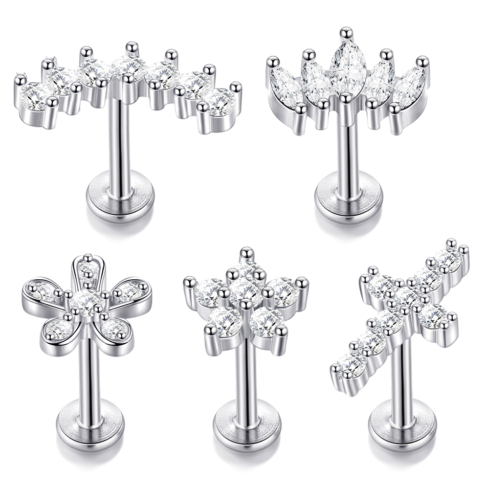SWANJO 2pcs Anéis Labret De Cristal De Aço Inoxidável CZ Tragus Piercings De Cartilagem Brinco Plano 16G Cross Conch Rook Lobe Helix