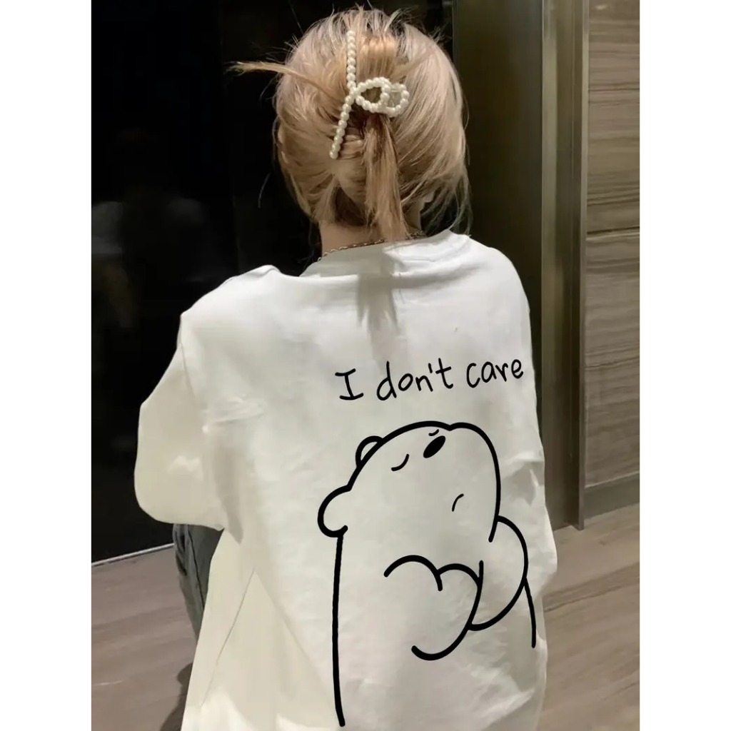 T-shirt casual branca com decote redondo, ajustada e folgada, de comprimento médio, para mulheres, com estampado de letras fofas de um urso e "Não me importo", manga curta, para primavera/verão. ✅Sobre o produto: ✔ Estampa: dtf ✔ Tecido: algodão ✔ Composição: fio 30.1 ✔ Modelo: camiseta oversized - unissex ✔ Disponível nos tamanhos: P/ M/ G / GG/ G2/ G3 ✔ Etiquetas : etiqueta interna de composição e etiqueta de tamanho na gola ✔ Modelagem: corte amplo , reforço de gola ombro a ombro , gola ribana canelada 2,5 cm ✅Diferencial do nosso Produto: ✔ Garantia do vendedor: 7 dias ✔ Ótima qualidade ✔ Alta durabilidade ✔ Costura reforçada ✅Tabela de Medidas: ✔ P: comprimento 76 cm/ largura 56 cm/ manga 24 cm ✔ M: comprimento 77 cm/ largura 58 cm/ manga 25 cm ✔ G: comprimento 77 cm/ largura 61 cm/ manga 26 cm ✔ GG: comprimento 78 cm/ largura 63 cm/ manga 27 cm ✔ G2: comprimento 80 cm/ largura 65 cm/ manga 28 cm ✔ G3: comprimento 81 cm/ largura 68 cm/ manga 29 cm ✅Avisos e Cuidados: ✔ Não utilize alvejante, água quente, ou lavagem no modo pesado da sua máquina ✔ Lave de preferência em água fria, não deixando a sua camiseta oversized de molho ✔ Estenda após a lavagem, com secagem de preferência na sombra ✔ Passe sempre pelo avesso e utilize preferencialmente em uma tábua de passar roupa ✅Dúvidas frequentes: ✔ O produto é novo? Sim, todos nossos produtos são novos. Todos as camisetas oversized ficam em estoque, assim que são vendidos, separamos o produto em nosso estoque e iniciamos o processo de envio ✔ Qual o prazo para postagem? A postagem de todos os pedidos são feitas em até 01 dia útil (24 horas úteis). Pedimos este prazo para prepararmos todas as etapas da compra (separação no estoque, embalagem e envio para os correios) Caso tenha qualquer dúvida sobre o andamento da sua compra fique a vontade para enviar mensagens, teremos prazer em responder ✔ Comprei, mas não chegou. O que pode ter acontecido? Raríssimas vezes, um outro pedido é extraviado pelos Correios. O carteiro pode ter sido assaltado, ou simplesmente terem perdido a mercadoria. Mas não se preocupe, caso isso aconteça, faremos o envio de um novo produto, ou se preferir faremos a devolução de 100% do valor pago 🚚 Envio Super Rápido 🥰 Para dúvidas, estamos à disposição no chat