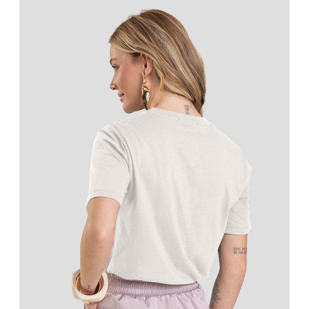 T-Shirt Feminina Dianna, confeccionada em meia malha de toque leve e confortável, ideal para o dia a dia. Possui decote redondo em ribana com reforço nas costas, que garante melhor estrutura e durabilidade à peça. Apresenta mangas curtas e estampa localizada de fruta, enriquecida por bordado e lantejoulas salpicadas no centro da laranja cortada, trazendo um toque delicado e vibrante ao visual. A barra conta com acabamento em bainha, proporcionando caimento natural e acabamento impecável.