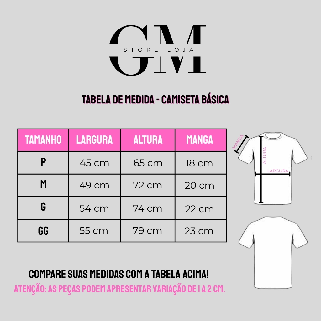 ⚠️ ATENÇÃO AO MODELO DA CAMISETA 🔹 Este modelo é CAMISETA BÁSICA (modelagem tradicional/unissex) 🔹 Não é baby look e não possui modelagem acinturada 🔹 A modelagem é reta e pode ficar mais solta e comprida no corpo 📏 Recomendamos conferir atentamente as medidas antes da compra e comparar com uma camiseta que você já utiliza. 🌟 Destaques do Produto ✔ Confeccionada em 100% algodão de alta qualidade ✔ Tecido macio, confortável, resistente e com ótimo caimento ✔ Estampa DTF premium, com cores vivas e excelente durabilidade ✔ Modelagem confortável, ideal para uso diário, passeios e momentos casuais 📏 Tamanhos Disponíveis P – Largura: 45 cm | Comprimento: 65 cm M – Largura: 49 cm | Comprimento: 72 cm G – Largura: 54 cm | Comprimento: 74 cm GG – Largura: 55 cm | Comprimento: 79 cm 🔎 Confira atentamente as medidas antes da compra para garantir o melhor ajuste. 🚚 Informações Importantes ✔ Produto novo ✔ Envio rápido ✔ Qualidade garantida ⚠️ Observação: As cores da estampa podem sofrer pequenas variações conforme a iluminação da foto ou as configurações da tela do seu dispositivo. 🧼 Cuidados com o Produto -Lave a camiseta pelo avesso, evitando amassar a estampa -Não utilize alvejante, água quente ou lavagem no modo pesado -Lave preferencialmente em água fria e não deixe de molho -Após a lavagem, estenda e seque preferencialmente à sombra -Não passe o ferro sobre a estampa; passe sempre pelo avesso