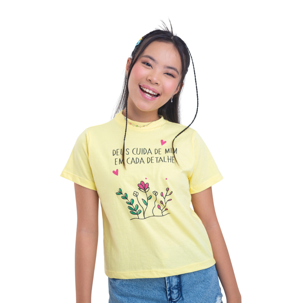 T-shirt Infantil Amarela Estampada Deus Cuida de Mim Blusa Menina Algodão Confortável e Estilosa