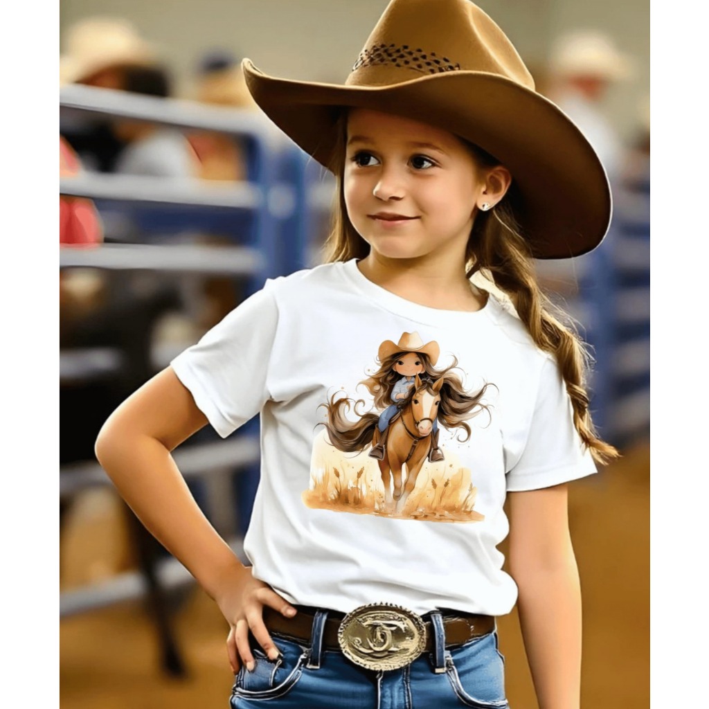 T-shirt Infantil Feminina Estampa Menina No Cavalo 100% Algodão Toque Macio Blusa/Camiseta/Camisa