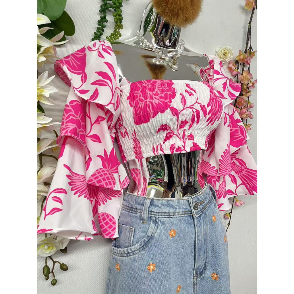T079Cropped Maria Ciganinha Manga Longa Em Camadas E Babados