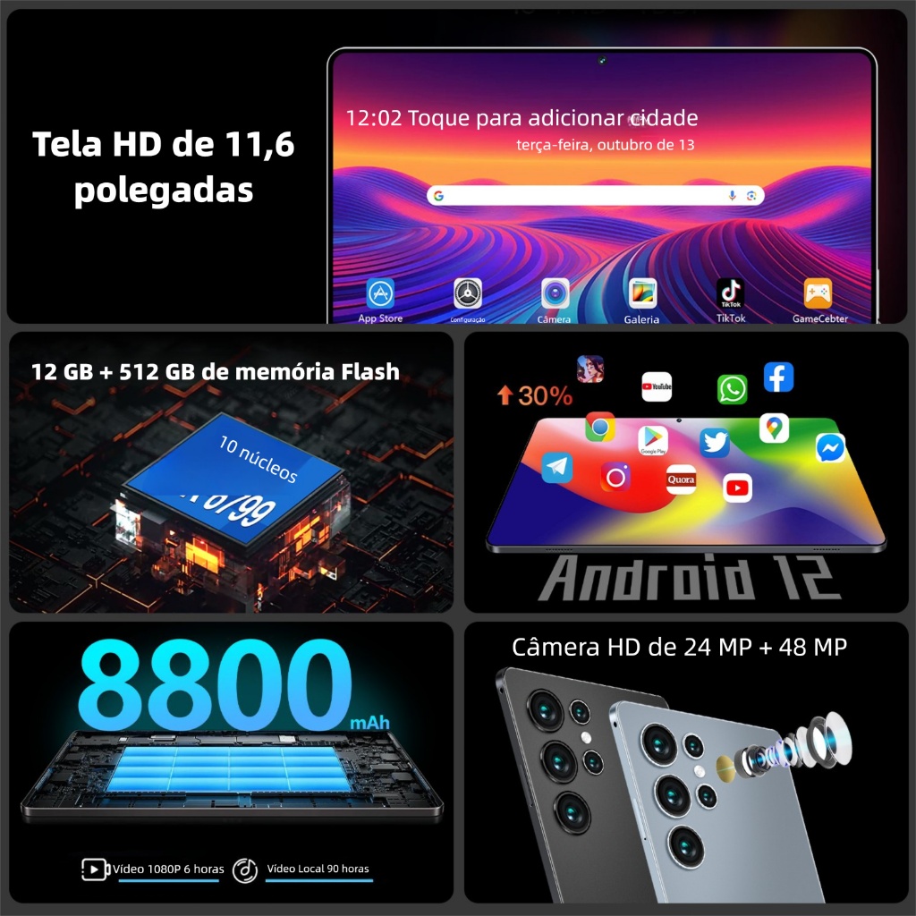 Tablet Galaxy S10 PRO 11,6 polegadas12GB+512 GB 5G Computador comcartao SIM duplo para entretenimento eaprendizado