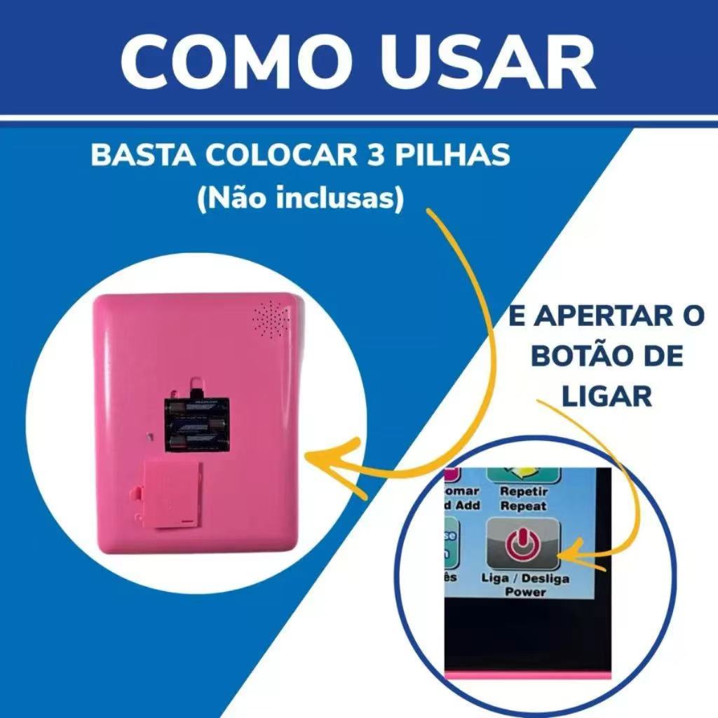 Tablet de brinquedo Interativo Didático Educativo Bilingue Português e Inglês Infantil Selecione a cor desejada antes de efetuar a compra na opção de variação (Azul/ Rosa) O tablet infantil bilíngue tem como característica, através dos jogos desenvolver na criança o raciocínio lógico, habilidades visuais, habilidades auditivas, habilidades tátil-visual e musical. Ele possui mais de 50 funções para a criança brincar e aprender. Com esse Tablet de Brinquedo Educativo vai ficar mais fácil e divertido aprender português e inglês. A criança aprenderá brincando o alfabeto, formar palavras, soletrar e tudo isso tanto em português como em inglês. O Tablet também conta com brincadeira de matemática, como fazer contas de soma, de subtração. Características: - Brinquedo com Atividades Educativas -Composição: Plástico ABS e Metal - Bilingue (Português/ Inglês) - Desenvolve Percepção visual, Percepção auditiva, Habilidade Sensorial, Raciocínio Lógico. -Joguinhos interativos de: somar, subtrair, soletrar palavras - Possui apenas a tela inicial (Não é Display a tela é fixa) - Botões de animais, Frutas, meios transportes e Objetos. - Com cálculos. - Pronúncia de palavras, Palavra Soletrada, Música, Botão de Letras - Números de 1 a 10 - Palavras de A à Z - Tecla liga/desliga, de volume e repetir - Utiliza 03 Pilhas AA (Não incluso) - Certificado pelo Inmetro - Não possuí acesso à Internet Teclado Interativo com as teclas: - Inglês - Português