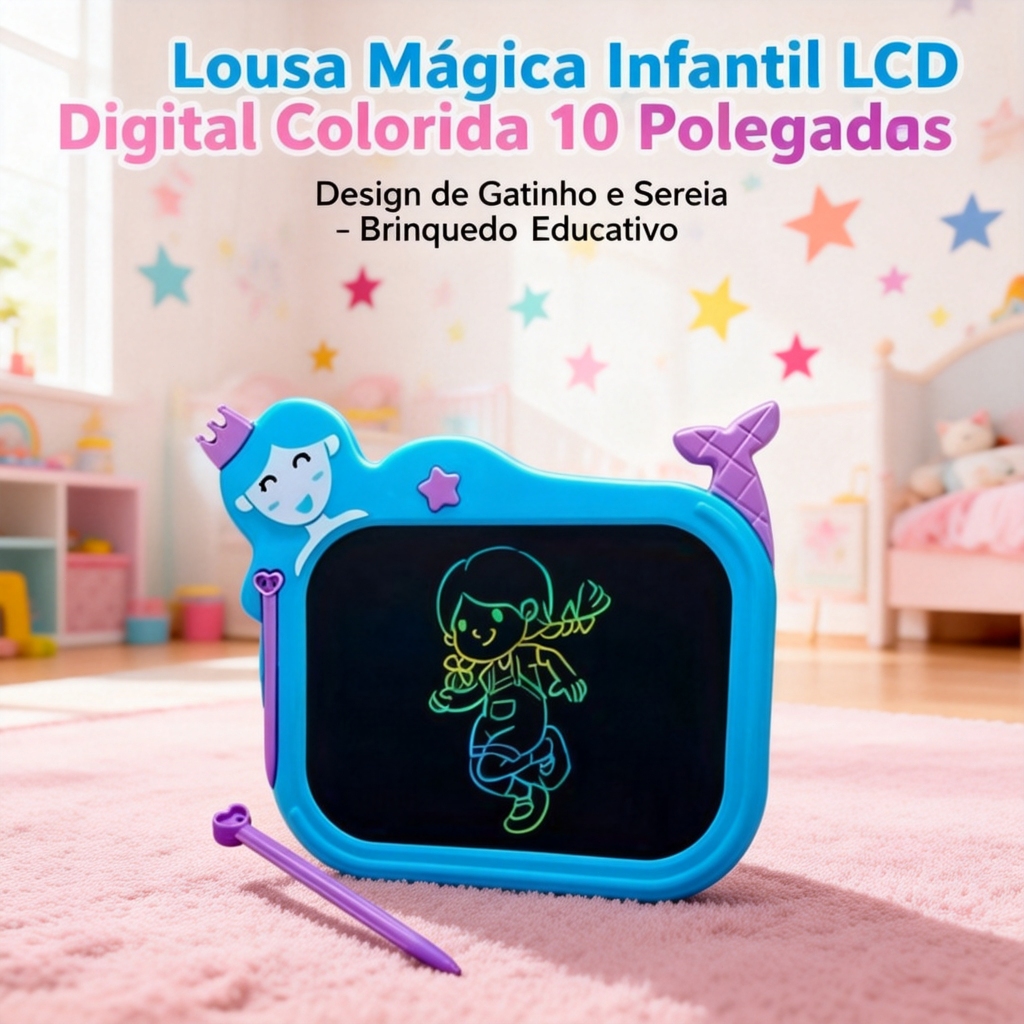 Tablet Lousa Mágica LCD Digital Colorido 10 Polegadas com Design de Gatinho e Sereia – Brinquedo Educativo Perfeito para