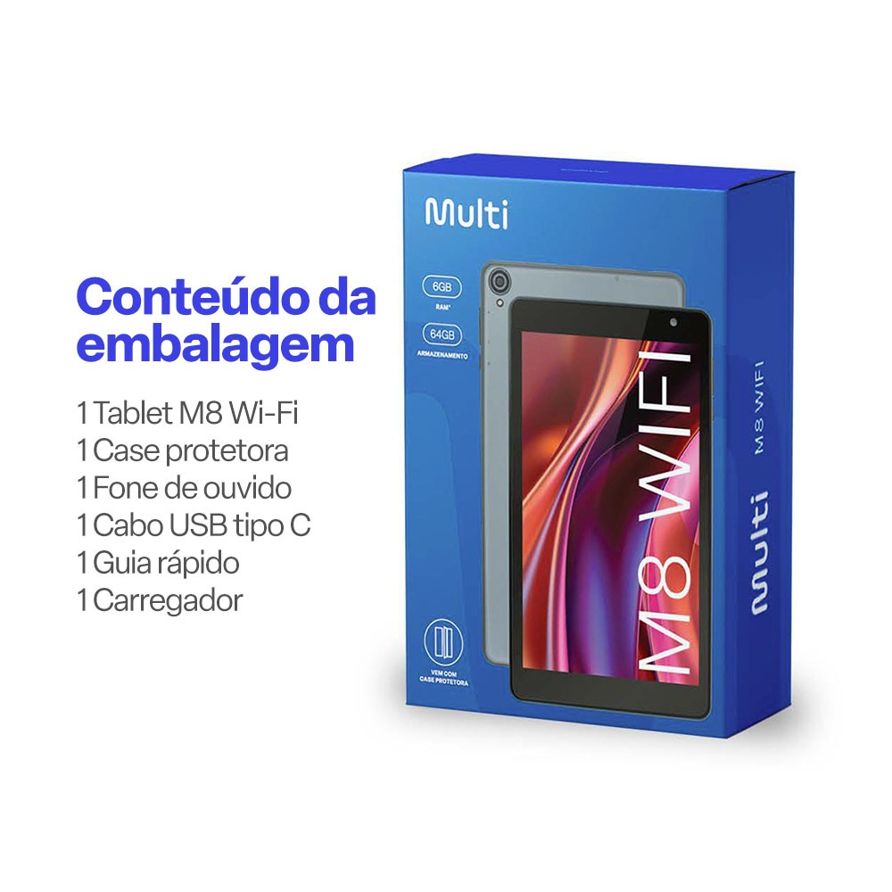 Tablet M8 Multi Wi-fi 64GB Tela 8 Pol 6GB RAM Android 13 Octa-Core - NB426 O tablet parceiro para tudo Leve e versátil. O Tablet Multi M8 acompanha você em qualquer lugar e em todas as suas atividades. Com 6GB de RAM (4GB interno + 2GB memória virtual) e 64GB de armazenamento com possibilidade de expansão de até 128 GB com cartão de memória (Cartão de memória não incluído), tenha um tablet com desempenho potente e eficiente. A memória virtual expande a capacidade da memória RAM do dispositivo, permitindo que o tablet utilize uma parte da Memória de Armazenamento como memória RAM, melhorando a performance do Tablet em até 30 Tela em HD de 8 polegadas Assista, leia, jogue ou faça tudo o que você quiser, com conforto visual e cores vibrantes. Sistema operacional Android 13 Navegue com facilidade, baixe aplicativos e desfrute de uma interface intuitiva e segura. Processador Octa-Core Desempenho garantido com o processador de oito núcleos. Case protetora resistente Mantenha seu tablet protegido em todos os momentos. Conexões wi-fi e bluetooth Você fica sempre conectado, tornando sua experiência com o Tablet Multi M8 ainda mais completa. Com controle parental e Google Kids Space As crianças se divertem e aprendem por meio de atividades e práticas estimulantes, sempre com muita segurança e supervisão dos pais. Câmera frontal 2MP e traseira 5MP Registre momentos especiais com praticidade. Você merece mais! Acompanha fone de ouvido para você aproveitar ao máximo o Tablet Multi M8. Ficha técnica Marca: Multi Modelo: Tablet M8 Multi Wi-fi 64GB Tela 8 Pol 6GB RAM Android 13 Octa-Core - NB426 Cor: Cinza Tamanho tela: 8 Pol HD IPS 1280x800 Sistema operacional: Android 13 Processador: Octa-Core 1.8GHZ Memória interna: 64 GB expansível até 128 GB por cartão microSD (não incluído) Memória RAM: 6GB (4GB interno + 2GB memória virtual ) Bateria: 4.000 mAh de lítio Resolução câmera: traseira 5MP, frontal 2MP Conexões: wi-fi, bluetooth e USB tipo C Entrada para chip: Não Conteúdo da embalagem: 1 Tablet M8 WI-FI, 1 Case protetora, 1 Fone de ouvido, 1 Cabo USB tipo C, 1 Guia rápido e 1 Carregador Dimensões (LxAxC): 11,6 x 1.3 x 19,1cm Peso: 500 g Garantia: 1 ano Certificado Anatel: 03790-24-03111 Imagens meramente ilustrativas.