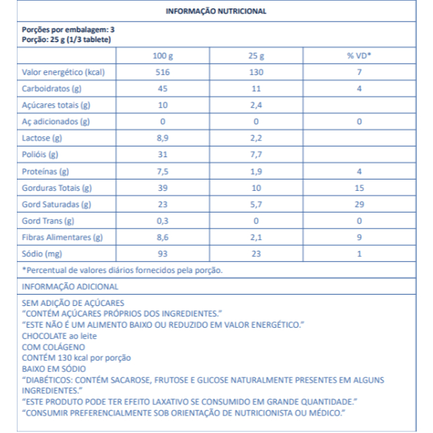 Linea Chocolate Ao Leite é sem adição de açúcares. Adoçado com sucralose e maltitol, contém 152kcal por porção. Com a manteiga de cacau como o 1º ingrediente, resulta em um chocolate macio e cremoso. Possui colágeno, e é fonte de fibras. Sabor indescritível que derrete na boca! INGREDIENTES manteiga de cacau, leite em pó integral, massa de cacau, soro de leite desmineralizado, colágeno, fibra de milho solúvel, edulcorantes: maltitol e sucralose, umectante: polidextrose, emulsificantes: lecitina de soja e poliglicerol polirricinoleato e aromatizante. ALÉRGICOS: CONTÉM DERIVADOS DE LEITE E SOJA. CONTÉM LACTOSE. NÃO CONTÉM GLÚTEN.