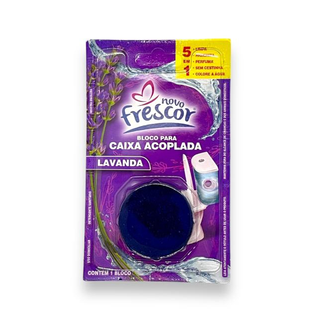 TABLETE PARA CAIXA ACOPLADA NOVO FRESCOR - 45G - Fragrâncias disponíveis: Lavanda - Pinho. O Tablete para Caixa Acoplada Novo Frescor age a cada descarga colorindo a água e deixando um agradável perfume, ajudando a manter seu vaso sanitário limpo e perfumado! - Os agentes de espuma e limpeza do Tablete para Caixa Acoplada Novo Frescor liberam um agradável Frescor azul, descarga após descarga, por algumas semanas. Use regularmente para manter seu vaso sanitário limpo e brilhante. - Além disso, é muito fácil de usar. Basta inserir o tablete dentro da caixa acoplada, e ele vai se dissolvendo aos poucos, sem que você precise tocar no vaso sanitário. Assim que a água não estiver saindo colorida, é hora de colocar outro Tablete Novo Frescor em sua caixa acoplada. - O Limpador Sanitário em Tablete para Caixa Acoplada Novo Frescor é especialmente indicado para a limpeza completa do seu vaso sanitário começando pela caixa acoplada e chegando até as paredes do vaso sanitário. MODO DE USO: 1 - Retire o tablete da embalagem plástica. 2 - Abra a tampa da caixa acoplada, em seguida insira o tablete Novo Frescor posicionando o produto longe da saída de água. 3 - Recoloque a tampa da caixa acoplada e aguarde 10 minutos para acionar a descarga. 4 - Quando a coloração da água diminuir, coloque outro Tablete para Caixa Acoplada Novo Frescor. Precauções e Segurança: Conserve fora do alcance das crianças e dos animais domésticos. Não expor o produto ao sol e calor acima de 35ºc. Não reutilizar a embalagem vazia. Lavar as mãos após o manuseio do produto. Em caso de contato com os olhos, lavar com água em abundância. Em caso de ingestão, não provocar vômito e consultar imediatamente o centro de intoxicações ou serviço de saúde mais próximo levando a embalagem vazia. Nunca reutilizar a embalagem vazia. ----- Para mais duvidas nós da Napoli Descartáveis estaremos a disposição de ajuda-los.