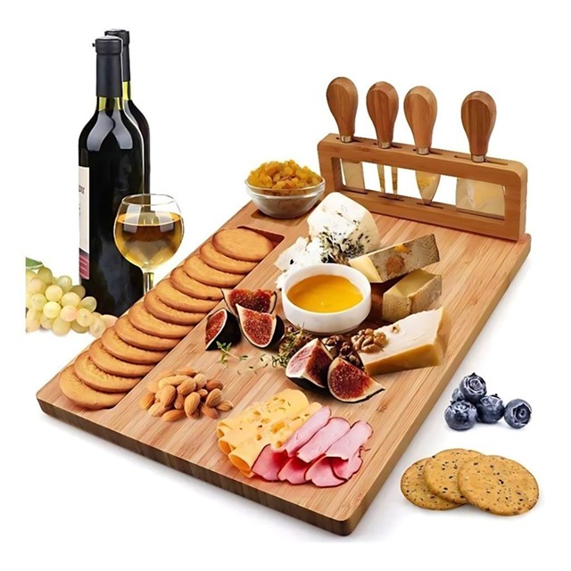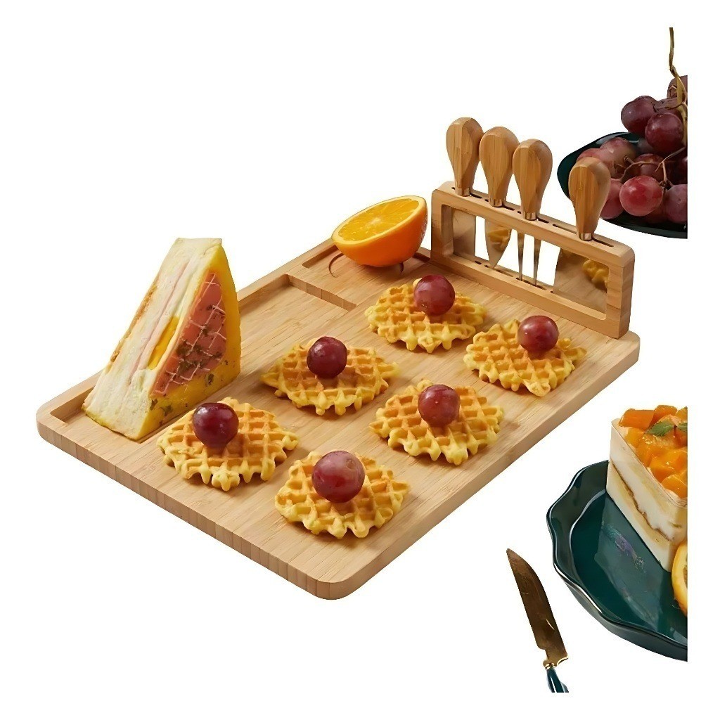 Tabua Bambu Queijos e Frios + Kit Espátulas 04 Peças