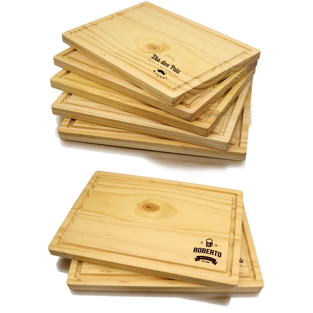 Personalizamos como desejar, uma frase, um logo ou nome, basta nos enviar uma imagem a ser gravada. Após a compra, envie imediatamente a personalização desejada no chat. APENAS 1 PERSONALIZAÇÃO DE NO MAX 7CM Tábua de corte para carne ou legumes. Material: Madeira de pinus. Tamanho: 19cm X 29 cm Espessura: 17mm. Material: Madeira Pinus Reflorestamento Tábua tem acabamento com óleo mineral, que impermeabiliza a madeira e confere um toque aveludado, além de facilitar a higienização. Recomendações de Uso: Antes do primeiro uso, lave o produto e enxágue bem. Após cada uso, lave normalmente o produto com esponja macia, sabão e detergente e seque com toalha de pano. Guarde em locais arejados para auxiliar a secagem da peça Não lave o produto em lava-louça, e não deixe secar ao sol, não leve o produto ao forno ou freezer. Não deixe a tábua submersa em água. Observações: A Madeira Pinus por ser natural possui veios e nós. Afinal, este é o charme dela. *****Dúvidas Frequentes: - Fazem outros tamanhos? Quase todos! Entre em contato conosco. - Quantos dias em média para entrega? Como utilizamos os Correios com entrega rápida no máximo 4 dias úteis (podendo variar para mais ou para menos). Já tivemos muitas entregas realizadas em 2 dias. - Posso comprar no Boleto? Sim. Você pode comprar no boleto, no cartão etc.. são muitas formas de pagamento. Garantia de Troca: Garantia de 7 dias quanto a defeitos de fabricação