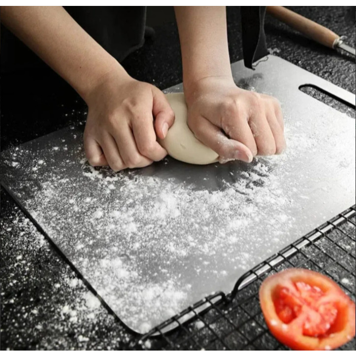 Tábua de Corte em Aço Inox 46 x 30 cm – Durável, Higiênica e Versátil Eleve o padrão da sua cozinha com esta tábua de corte em aço inoxidável de alta qualidade. Com dimensões de 46 x 30 cm, oferece um amplo espaço para o preparo de diversos alimentos com segurança, praticidade e estilo. - Características Principais Material: Aço inoxidável de alta resistência, anticorrosivo e fácil de limpar. Dimensões: 46 cm (comprimento) x 30 cm (largura). Design Dupla Face: Um lado liso para cortes precisos e outro texturizado que oferece maior aderência ao cortar carnes. Alça Integrada: Facilita o manuseio e permite pendurar a tábua para secagem e armazenamento. Higiene Superior: Superfície não porosa, que evita a proliferação de bactérias e odores. Versatilidade: Ideal para cortar carnes, legumes, frutas, pães e outros alimentos. - Modo de Higienização Mantenha sua tábua de inox sempre limpa e segura com cuidados simples: Lave após cada uso com água corrente, detergente neutro e esponja macia, removendo todos os resíduos. Enxágue abundantemente, certificando-se de retirar completamente o sabão, pois resíduos podem causar manchas. Seque imediatamente com um pano limpo ou papel toalha. A umidade prolongada pode provocar marcas e favorecer a proliferação de bactérias. *Com esses cuidados, sua tábua manterá o brilho, a funcionalidade e a higiene por muito mais tempo! -Benefícios: Durabilidade: Aço inox robusto, ideal para uso diário intenso. Fácil de Limpar: Pode ser lavada à mão ou na lava-louças. Segurança Alimentar: Superfície higiênica que não retém odores ou resíduos. Design Moderno: Complementa a estética de cozinhas domésticas ou profissionais. Perfeita para quem busca qualidade, higiene e praticidade na cozinha. Seja em casa ou em um ambiente profissional, esta tábua atende às necessidades dos cozinheiros mais exigentes. Tags tábua de corte de aço inoxidável tábua de corte profissional utensílio de cozinha inox tábua higiênica para alimentos tábua inox para carne tábua durável inox tábua inox fácil de limpar tábua de corte dupla face utensílio inoxidável cozinha moderna
