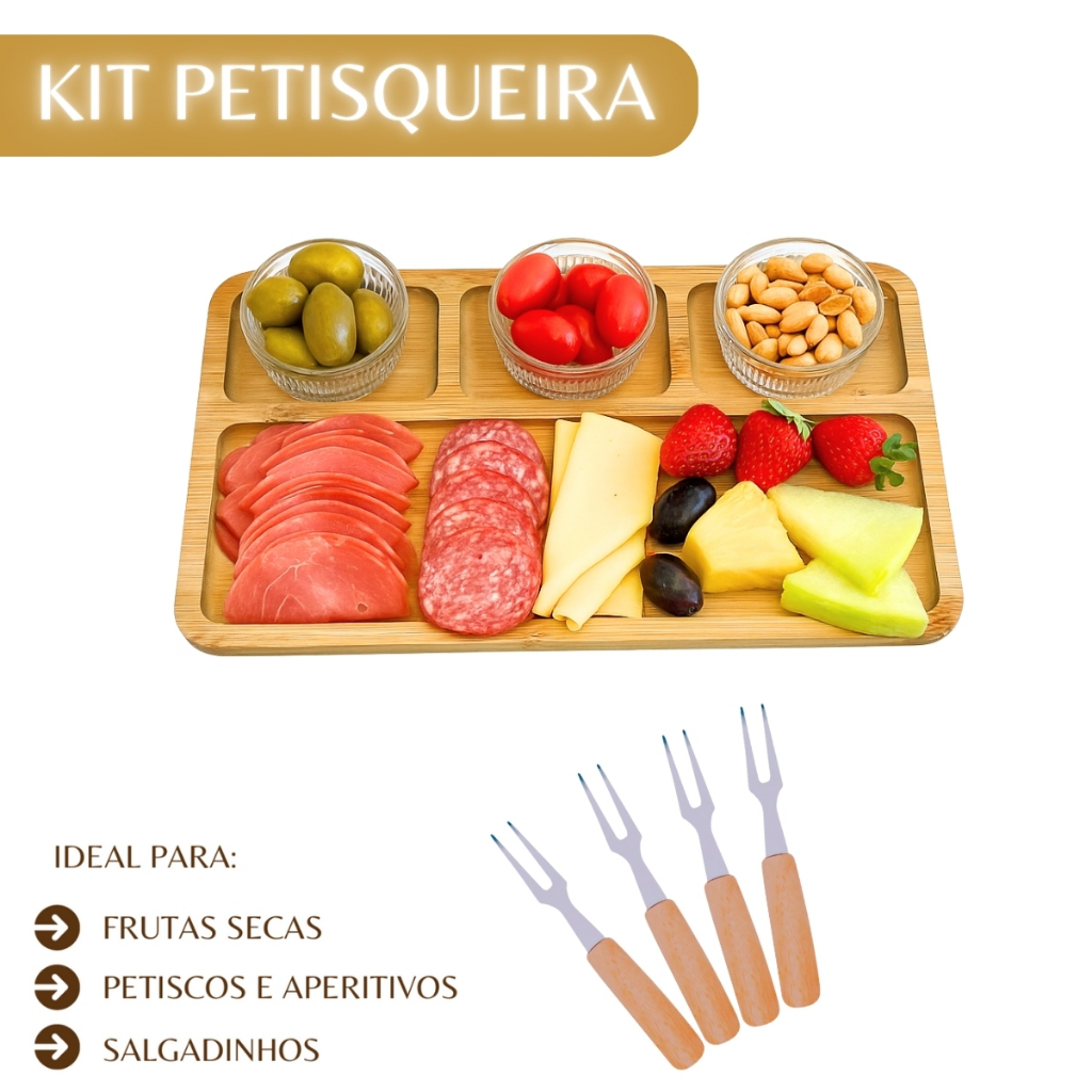 Tábua de Frios Petisqueira de Bambu Kit Petisqueira Mesa Posta 5 Peças