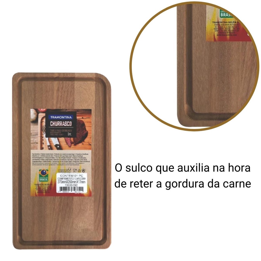 Muito mais estilo e praticidade para sua cozinha, com a tábua Tramontina retangular em madeira com acabamento natural lixado. Ideal para cortar e servir alimentos, como aquela carne deliciosa do seu churrasco de domingo, ela tem produção em madeira mista, conta com um acabamento natural lixado e sulco que auxilia na hora de reter a gordura da carne. Escolha Tramontina e deixe suas atividades na cozinha ainda mais práticas! Características: - Marca: Tramontina - Modelo: 13530092 *Imagens Meramente Ilustrativas Recomendações de Uso: - Antes do primeiro uso, lave o produto e enxágue bem. - Quando estiver seco, esfregue um pouco de óleo de cozinha na superfície, retirando bem o excesso. - Após cada uso, lave normalmente o produto com esponja macia, sabão e detergente. Seque com toalha de pano. - Guarde em locais arejados [evite ambientes abafados como gavetas e armários]. - Não lave o produto em lava-louça, nem utilize esponja de aço. - Não deixe o produto submerso em água. - Não deixe o produto secar ao sol, nem deixe secar em pé na pia. - Não empilhe as peças quando estiverem úmidas. - Não leve o produto ao forno ou geladeira. Especificações Técnicas: - Madeira: Mistas - Acabamento natural lixado - Embalagem plastificada + folheto churrasco - Possui Sulco Dimensões Aproximadas: - Altura: 1,7cm - Largura: 19cm - Comprimento: 37cm Conteúdo da Embalagem: - 1x Tábua