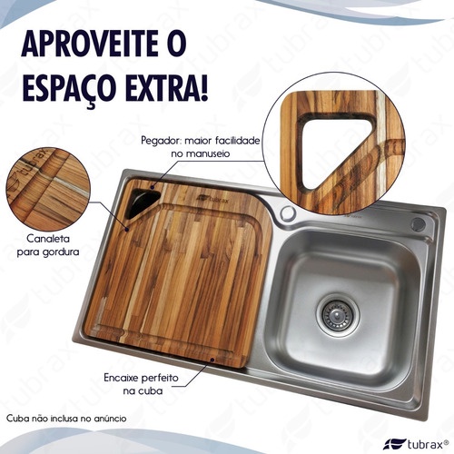 Tábua de Preparação de Alimentos Tubrax em Madeira Teca - exclusiva para as Cubas Tubrax modelo Utile (CAC0009) e modelo CBC0006. Referência MAC0005 Elaborada em madeira Teca, material de extrema durabilidade, com alta resistência à água e a esforços mecânicos, a Tábua de Preparação de Alimentos Tubrax irá deixar a sua cozinha com um design ainda mais inovador, pois possui encaixe perfeito nas Cubas modelo Geminus da Marca Tubrax®, facilitando assim a preparação dos alimentos e tornando o a tarefa de cozinhar um verdadeiro prazer! IMPORTANTE Imagens Ilustrativas: Por se tratar de um produto feito em madeira, a sua tonalidade pode variar de acordo com a peça, não sendo possível a definição clara no momento do envio. A Tonalidade do material poderá ser desde a cor mais clara até um tom escuro e sempre terá um padrão com cores mistas. Para uma maior durabilidade, é importante que sigam algumas orientações básicas: • Ao primeiro uso, é importante que lave o produto com água quente e sabão tipo neutro, e enxugue-a bem, preferencialmente utilizando papel toalha; • Após esse procedimento e a mesma estiver bem seca, passe um pouco de óleo de cozinha sobre toda a superfície, retirando o excesso com papel toalha. Isso apenas deve ser feito em seu primeiro uso, ou quando a mesma ficar por um longo tempo sem uso; • Lembre-se sempre de utilizar água e sabão neutro na higienização do produto; • Antes de guardá-la, sempre certifique-se que a mesma está totalmente seca. Caso haja umidade, deixe-a em local arejado. Obs: Leves alterações na coloração e acabamento podem acontecer entre diferentes lotes do produto. ESPECIFICAÇÕES TÉCNICAS: - Marca: Tubrax - Referência do Modelo: MAC0005 - Material: Madeira Teca - Comprimento: 39 cm - Largura: 38,5 cm - Espessura: 2 cm - Peso bruto (com embalagem): 1,65 Kg - Garantia: 3 meses contra qualquer defeito de fabricação.