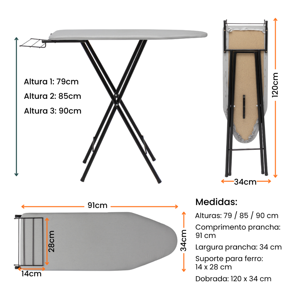 Tábua de Passar Roupa Dobrável com Porta-Ferro – Conforto, Segurança e Praticidade Transforme sua rotina com uma tábua de passar feita para durar. Ideal para quem busca estabilidade, segurança e praticidade, ela facilita o dia a dia e otimiza o espaço da sua lavanderia. Produzida com estrutura em aço resistente, prancha em madeira MDF e tecido metalizado antichamas, oferece conforto e eficiência na hora de passar roupas. Principais Benefícios Tecido metalizado antichamas: resistente ao calor e ajuda a agilizar o processo de passar Prancha em madeira MDF: firme, resistente e durável Porta-ferro dobrável: mais praticidade e segurança durante o uso Pés dobráveis: fácil de guardar, ideal para espaços pequenos Estrutura em aço pintado: estabilidade e longa vida útil Design compacto: dobra completamente para armazenamento rápido Especificações Técnicas Estrutura: Aço pintado Prancha: Madeira MDF Revestimento: Tecido metalizado antichamas Porta-ferro: Sim (dobrável) Pés dobráveis: Sim Uso: Residencial Armazenamento: Compacto, ocupa pouco espaço Medidas: Comprimento da prancha: 91 cm Largura da prancha: 34 cm Suporte para ferro: 14 x 28 cm Medida dobrada: 120 x 34 cm Altura regulável: Nível 1: 79 cm Nível 2: 85 cm Nível 3: 90 cm Ideal para: Casas e apartamentos com pouco espaço Uso diário Quem busca praticidade, leveza e resistência Organização e otimização da lavanderia Uma escolha prática, segura e funcional para tornar sua rotina muito mais simples.