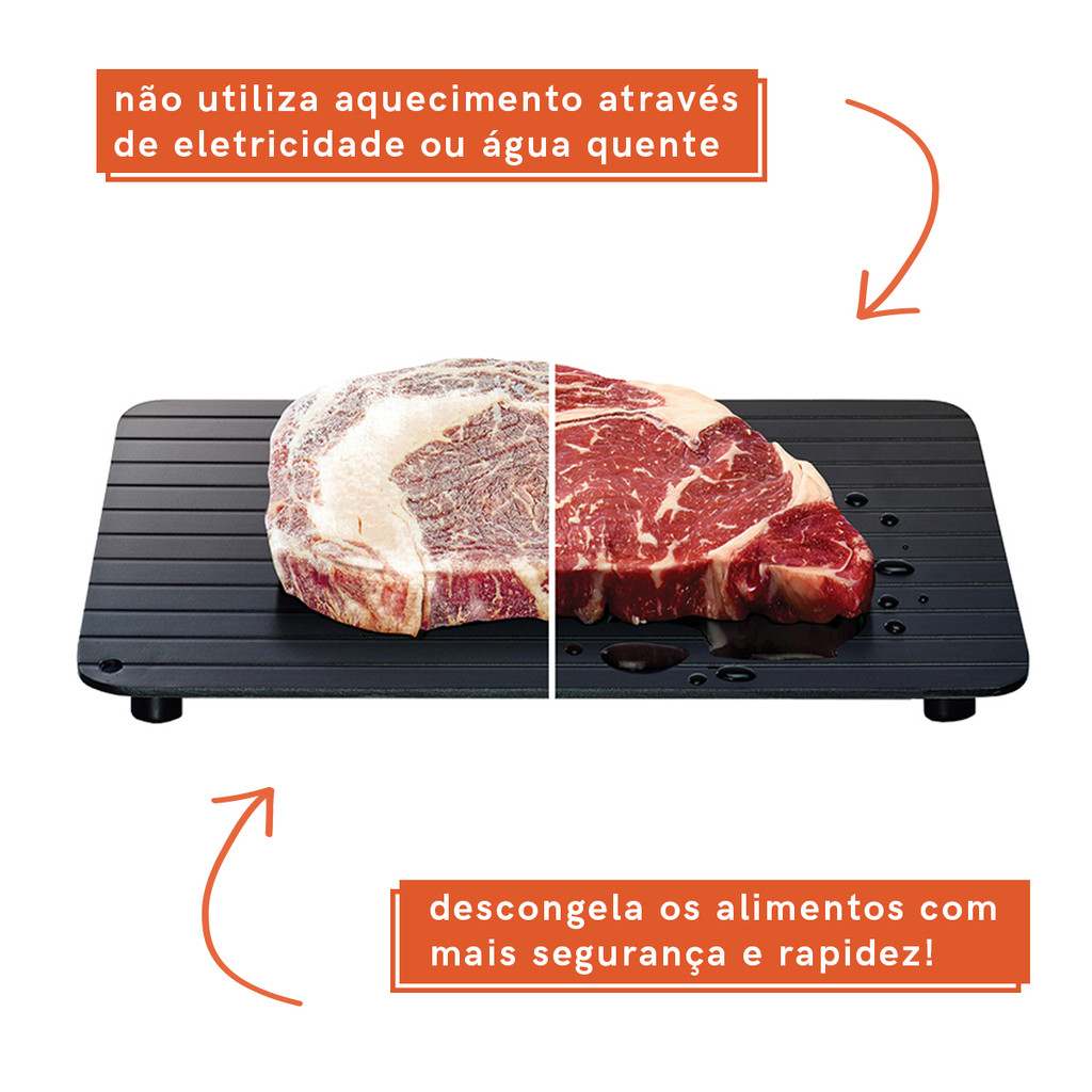 Essa é a tábua inteligente para descongelar da oikos. Essa vai para quem sempre esquece de tirar os alimentos com antecedência do freezer. Essa tábua descongela os alimentos 3 vezes mais rápido e de forma natural – sem perder propriedades e nutrientes dos alimentos. Não é mágica, é pura física: ela é feita de uma combinação de metais supercondutores de calor. Tudo acontece assim: o seu material acelera o descongelamento do alimento, que tenta igualar a sua temperatura com a da tábua. De quebra, com as ranhuras da sua superfície, a água é escoada, garantindo que a carne estará sempre em contato com a tábua. Ah, essa tábua não serve para corte, ok? é só para descongelar mesmo.