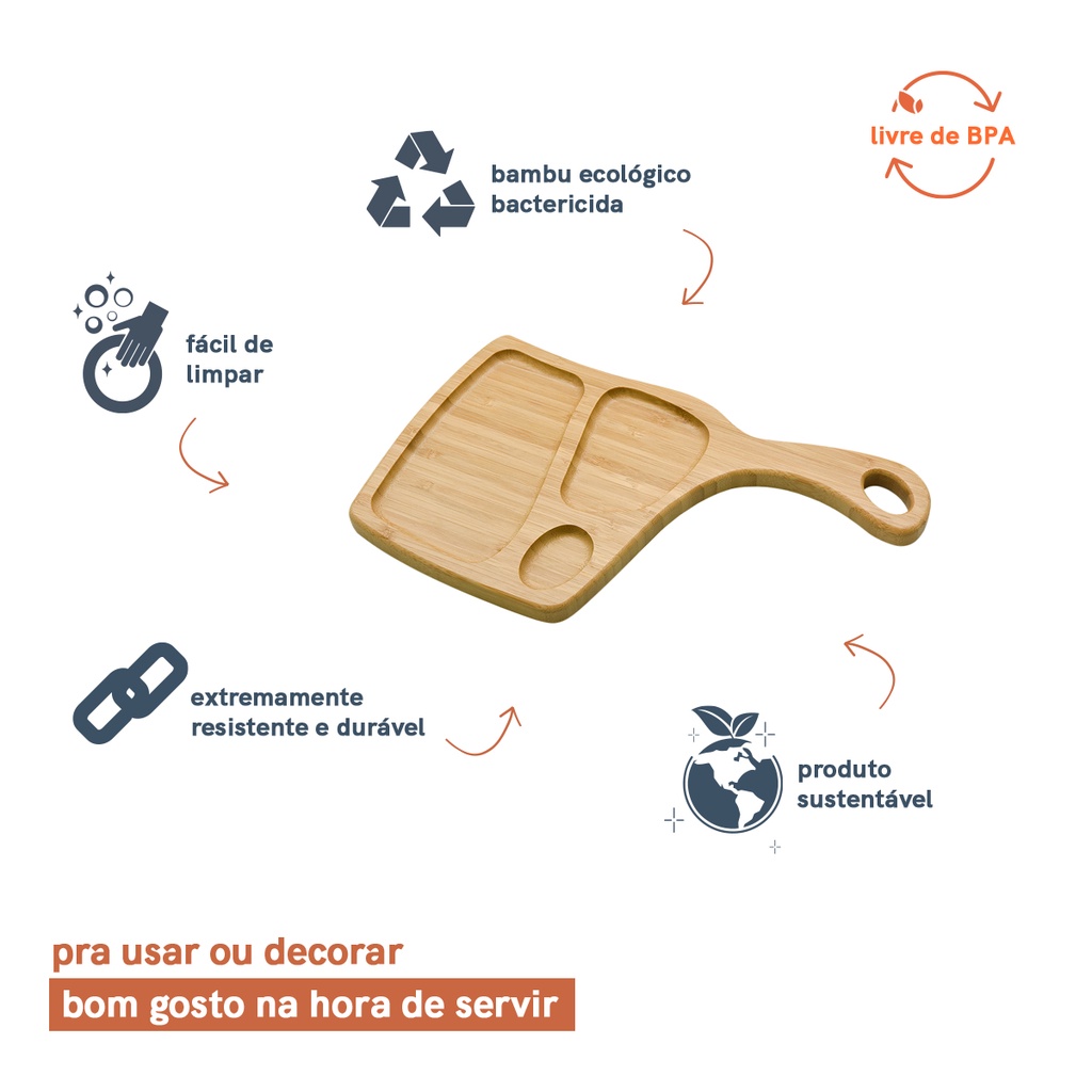 Essa é a tábua petisqueira de bambu com pega da OIKOS. De um lado sua superfície é lisa, bacana para cortar alimentos ou servir sanduíches. Do outro, ela tem divisões que ajudam na hora de servir petiscos ou aquele churrasco que você queria fazer - e fez! Com pegador, fica mais fácil de manusear a tábua e deixar os petiscos ao alcance de todos. Na hora da lavagem, basta higienizar com detergente neutro e guardar só quando ela estiver bem seca.