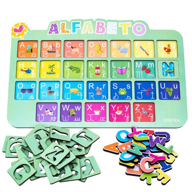 Jogo educativo infantil de tabuleiro aprenda brincando alfabeto encaixe letras em madeira didático pedagógico Montessori - Ensine as crianças de uma maneira divertida e lúdica com este tabuleiro e quebra-cabeça a conhecer as letras do alfabeto e a sequência correta, a montar as primeiras palavras, ao mesmo tempo ensinando o nome das cores mais comuns e estimulando a visão espacial nos encaixes adequados de cada letra no tabuleiro. - Um brinquedo aparentemente simples, porém que trabalha diversos estímulos de aprendizado no cérebro infantil, desde a coordenação motora até a percepção visual e concentração, tornando uma excelente ferramenta de ensino. - Indicado para pais, professores, educadores, escolas, recepções de clinicas e consultórios, salas de recreações, etc. - Possui 26 letras - 26 Figuras Ilustradas - Mais 4 formas de Letras Ilustradas - Confeccionado em madeira - Garantia de 3 meses contra defeitos de fabricação. ---------------------------------------------------------------------- Medidas tabuleiro: 42cm comprimento x 28 cm largura Letras: 6mm de espessura e 4 cm de Altura ---------------------------------------------------------------------- Contem: 1 Alfabeto Tabuleiro de madeira