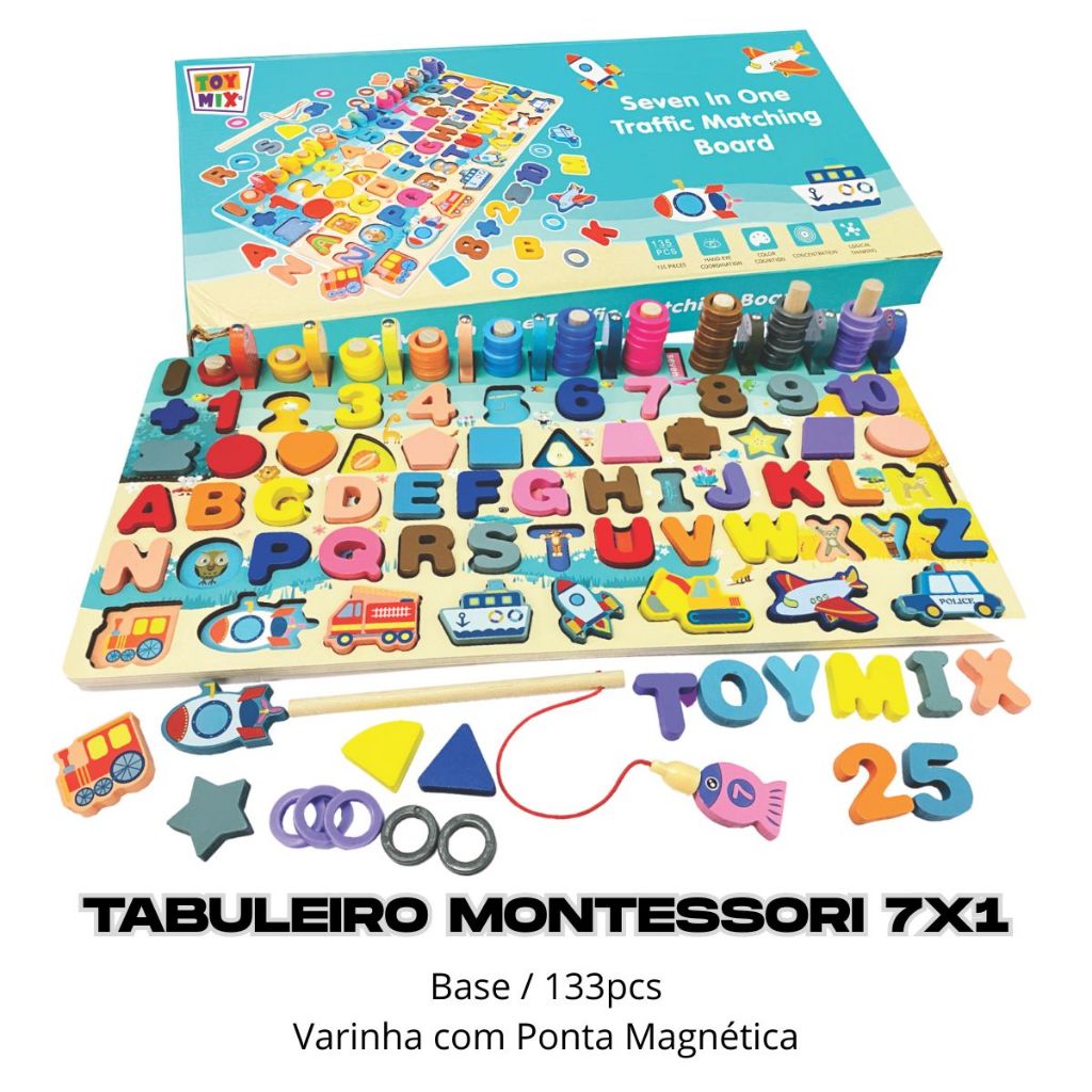 Tabuleiro Montessori Atividades Pescaria Encaixe Números e Letras – Brinquedo Educativo em MDF com 133 Peças Desperte o interesse pela aprendizagem com o Tabuleiro Montessori 133 Peças! Inspirado no método Montessori, este brinquedo educativo é ideal para estimular o desenvolvimento cognitivo e motor das crianças de forma divertida e interativa. Composto por 133 peças coloridas em MDF, o tabuleiro oferece múltiplas atividades, como: - Alfabetização inicial - Introdução à matemática - Coordenação olho-mão - Concentração e lógica Fabricado em MDF resistente e seguro, com acabamento suave, é um presente ideal para transformar o aprendizado em brincadeira! Idade recomendada: +3 anos Material: MDF Contém: 133 peças interativas ESCOLHA O MODELO E TAMANHO NA VARIAÇÃO