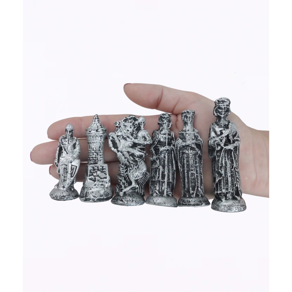 CARACTERÍSTICAS DO PRODUTO: - Jogo completo Coleção Medieval com 32 peças 16 dourado e 16 prateadas. - Acompanha tabuleiro 28x28x01, quadrados de 27mm - Fabricado em resina de alta qualidade e resistência. - Produto semi artesanal, pintado a mão, portanto pode ocorrer variações na tonalidade das cores. - Produto a pronta entrega. DIMENSÕES: REI: 8,0 cm RAINHA: 8,0 cm BISPO: 7,0 cm CAVALO: 7,0 cm TORRE: 6,0 cm PEÃO: 5,0 cm (altura).