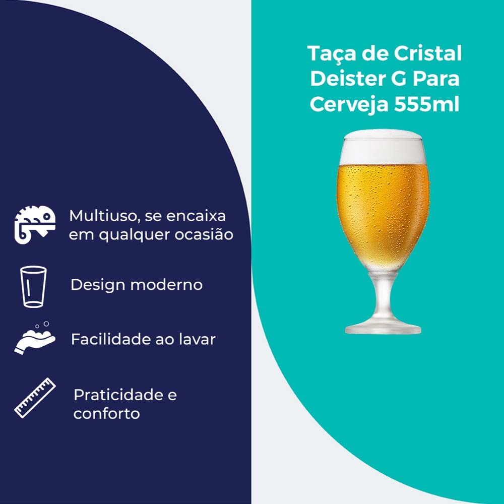 A Taça de Cristal para Cerveja Deister 555ml é a escolha perfeita para quem busca elegância e sofisticação na hora de saborear sua cerveja. Fabricada em cristal de alta qualidade, ela proporciona um visual impecável, destacando as cores e os aromas da sua bebida preferida. Com capacidade de 555ml, esta taça é ideal para servir diversos tipos de cerveja, permitindo que seus sabores se expressem plenamente. Seu design refinado e confortável ao toque garante uma experiência única e prazerosa, tornando qualquer momento de degustação ainda mais especial. A Taça de Cristal Deister é a escolha ideal para quem aprecia a arte de saborear cerveja com classe. Indicada para: Cerveja. Material: Cristal. Conteúdo da Embalagem: 1 Taça. Capacidade: 555ml. Diâmetro: 89mm. Altura: 194mm. - Peça medida com o volume máximo até a boca - Diâmetro é medido pela largura maior da peça. - Pode sofrer variação de até 10% de seu volume Dica de uso e preservação: • Recomendamos que a limpeza da peça seja feita a mão para evitar quebras ou danos. • Limpe a sujeira utilizando uma esponja macia, tire o resíduo de sabão e seque bem. • Não utilize abrasivos ou utensílios pontiagudos. • Evite impactos e não exponha o vidro a mudanças bruscas de temperatura pois poderá causar choque térmico e danificar seu produto. • Para realçar ainda mais o brilho da peça, limpe-a com uma flanela que não solte fiapos, levemente umedecida com álcool.