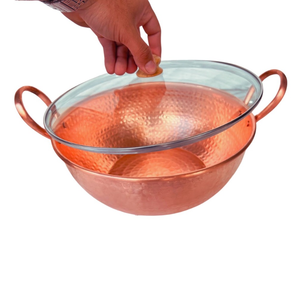 Tacho de cobre 5 Litros com alças de cobre e tampa de vidro+Colher de Madeira de Brinde
