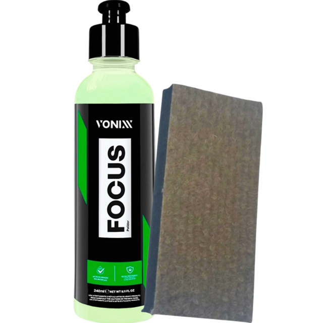 KIT CONTÉM: APLICADOR KATANA DETAILER FOCUS 240ML VONIXX ------------------------------------------ FOCUS 240ML - REMOVEDOR DE MARCAS DE ÁGUA PARA VIDROS VONIXX DESCRIÇÃO: Focus é um potente removedor de marcas d'água em vidros e espelhos. O produto é eficaz na remoção de marcas d'água em vidros automotivos, boxes de banheiro, espelhos ou qualquer tipo de vidro, sem risco de causar manchas. Ao contrário de produtos ácidos, ele possui um pH equilibrado e pode ser utilizado com total segurança MODO DE USO: 1. Coloque algumas gotas do produto em um aplicador específico para esse fim e comece a esfregar, aplicando pressão em uma área de aproximadamente 30x30cm 2. Remova o excesso de produto com água ou uma toalha de microfibra 3. Verifique se as marcas foram completamente removidas e caso contrário, repita o procedimento. 4. Continue o processo até concluir toda a superfície