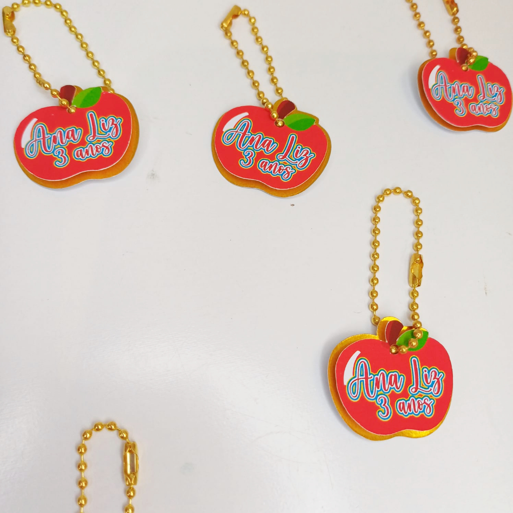 Tag Aplique 3D personalizada com correntinha | Maçã Branca de Neve | MONTADAS | Lembrancinhas Kit de Tags com aplique 3D e correntinha no formato de maçã da Branca de Neve. Caso deseje outro tema, basta chamar a gente no chat! Já vão montadas! - Tag: 4cm - Correntinha aberta 10cm e fechada 5cm - Feitas em papel 180g ATENÇÃO: Para personalização da tag, envie IMEDIATAMENTE nome e idade da criança pelo chat ou as tags serão enviadas APENAS com o TEMA e escrito obrigado pela presença, sem nome e idade.