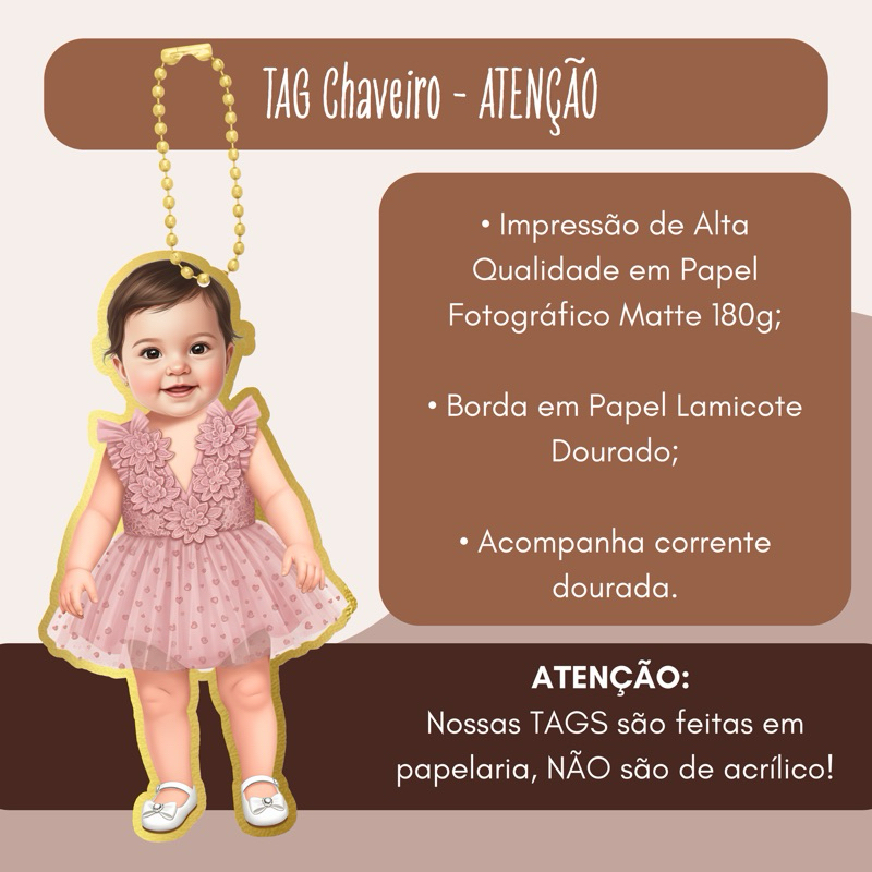 Já pensou em um mascotinho feito com as características e roupinha do seu filho? A coelhita cria para você! E, além de receber o mascotinho em PNG via email, você receberá em sua casa nossas TAGs Chaveiro Personalizada com o mascotinho criado para deixar seu evento ainda mais especial (escolha a quantidade desejada); Não se esqueça: após a compra envie o rostinho, roupinha, acessórios e sapato em boa qualidade para facilitar a criação; ATENÇÃO ⚠️⚠️⚠️ - Material: Papel Fotográfico Matte 180g + Papel Lamicote Dourado - Impressão de alta qualidade - Acompanha corrente dourada ⚠️ NÃO É DE ACRÍLICO OU MATERIAIS SEMELHANTES, TRABALHAMOS COM PAPELARIA PERSONALIZADA! Prazo de produção: 5 dias (recomendada a compra até 30 dias de antecedência do evento desejado); Prazo de entrega: - Ao clicar no anúncio e frete, você terá o prazo estimado para a entrega; - Não consigo acesso à logística de entrega da Shopee após o envio do pedido. A coelhita está sempre pronta para tirar dúvidas no chat!