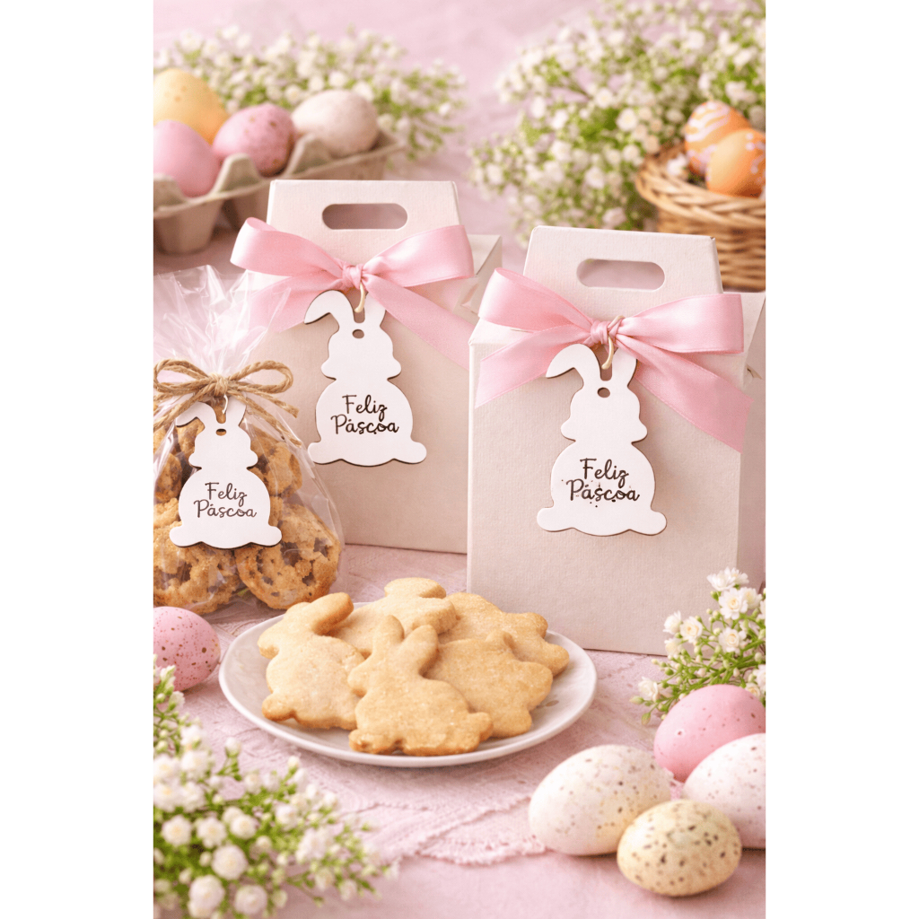 Tag Coelho Feliz Páscoa em MDF Branco Tag decorativa em formato de coelhinho, perfeita para lembrancinhas e embalagens de Páscoa. Ideal para sacolas, caixas, doces e presentes. 📏 Medida: 5 cm x 2,5 cm 🧱 Material: MDF Branco 📦 Quantidades: 10 / 30 / 50 / 100 unidades (escolha na variação) ✨ Produto leve, delicado e com acabamento de qualidade.