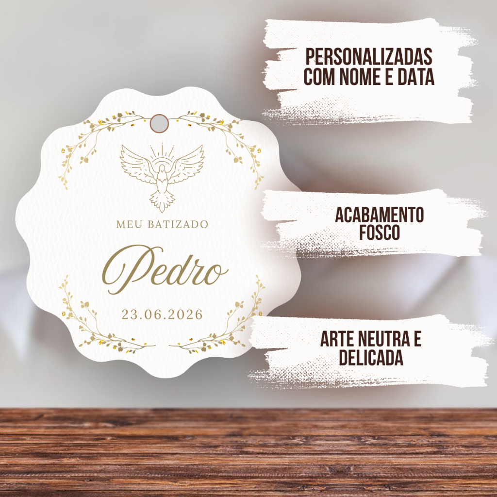 Tag para Batizado PERSONALIZADA NOME E DATA cores neutras e delicadas menino menina com furo 5x5 cm