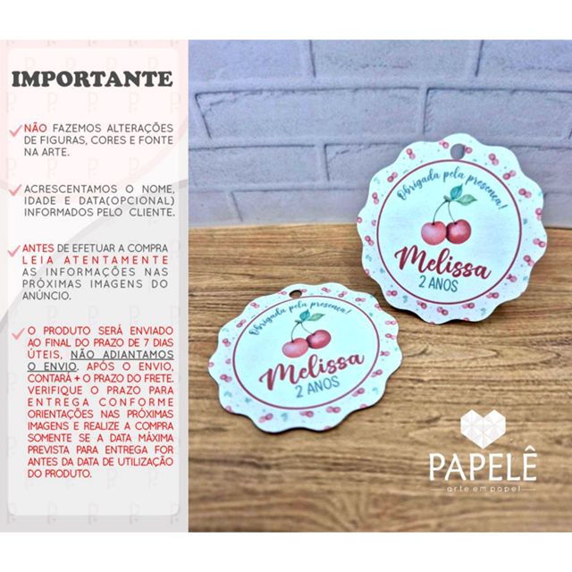 | Tag Personalizada para Lembrancinha Cereja / Cerejinha - 5cm este produto | R$ 19,00 | — | 5.0/5 | 5 |