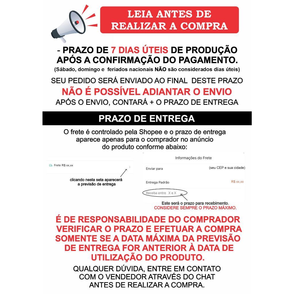 -ENVIO SERÁ FEITO AO FINAL DO PRAZO DE 7 DIAS ÚTEIS DE PRODUÇÃO (sábado, domingo e feriados nacionais não são considerados dias úteis); NÃO É POSSÍVEL ADIANTAR ENVIO. - APÓS O ENVIO, CONTARÁ + O PRAZO DE ENTREGA - ANTES DE REALIZAR A COMPRA VEJA O PRAZO DE ENTREGA PARA SUA CIDADE QUE CONSTA NO ANÚNCIO E VERIFIQUE SE CHEGARÁ ANTES DA DATA QUE PRETENDE UTILIZAR. - NÃO FAZEMOS ALTERAÇÕES NA ARTE. ACRESCENTAMOS APENAS O NOME/ IDADE / DATA --------------------------------------------------------------------------------------------------------------------------------------------------------------------------------------------- ***INFORMAÇÕES DO PRODUTO**** - Tag impresso em Papel Offset Fosco (gramatura 180) - Tamanho :5 cm - NÃO acompanha cordão, fita ou palito. - Impressão somente frente. - TODAS AS TAGS SÃO COM A MESMA ARTE. - Furo pode ser opcional ---------------------------------------------------------------------------------------------------------------------------------------------------------------------------------------------- - Após realizar o pedido, envie no campo de observação ou através do Chat nome / idade /data para personalização. - ARTE SERÁ ENVIADA PARA CONFIRMAÇÃO DO CLIENTE ANTES DA PRODUÇÃO NO PRAZO DE 4 DIAS ÚTEIS APÓS CONFIRMAÇÃO DE PAGAMENTO. FIQUE ATENTO AO CHAT. QUALQUER DÚVIDA, ENTRE EM CONTATO ATRAVÉS DO CHAT.