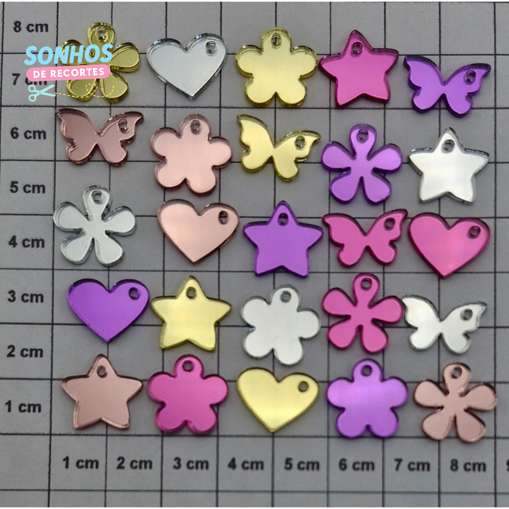 Pingente Acrílico Espelhado 1,5 cm. Modelos: borboleta, coração, estrela, flor 1 e flor 2. Cores disponíveis: Dourado, Prata, Rose, Roxo, Pink, Laranja, Azul, Verde e Vermelho. Quantidade: 25 ou 50 Unidades. Qualquer duvida entrar em contato com a equipe pelo chat da plataforma.