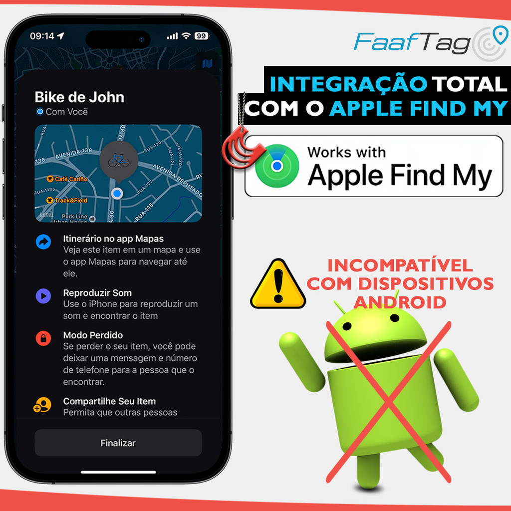 Carroussel Auto apresenta: A melhor solução de rastreamento rápida, eficiente e fácil de usar da Faaftech! ______ #USO# - Tag discreta ideal para rastrear tudo que você quiser: veículos, chaves, carteiras, bagagens, bolsas, pets, pessoas, família, amigos e muito mais - Fixação versátil pelo cordão incluso ou pelos acessórios vendidos separadamente: chaveiros e suportes ______ #TECNOLOGIA# - Integra todas funções do aplicativo Find My da Apple como: Itinerário no app Mapas, Reproduzir Som, Modo Perdido, Compartilhe Seu Item, Notificações, etc. - Alto-falante embutido para emitir um bipe ativado pelo aplicativo Find My - Compatível com iPhones com iOS 14.5 ou posterior, incluindo SE, XR, 13, 14 e 15 - NÃO é compatível com dispositivos Android ______ #ALCANCE# - Funciona em qualquer lugar do mundo - A localização da FaafTag é atualizada automaticamente quando um dispositivo Apple ligado à rede Find My estiver perto da FaafTag ______ #COMPACTO# - Diâmetro de 29mm e Altura de 9,5mm - Peso: 7 gramas ______ #BATERIA# - Acompanha bateria CR2032 com duração de até 1 ano - Bateria substituível utilizando a espátula inclusa para abrir a FaafTag ______ #ADICIONAIS# - A FaafTag NÃO é à prova d’água, mas alguns dos acessórios vendidos separadamente oferecem proteção contra água - Certificação ANATEL: 06426-24-16871 - Garantia de fábrica: 1 ano contra defeitos na fabricação ______ #CONTEÚDO DA EMBALAGEM# - 1 FaafTag FT-TAG com bateria - Espátula para abrir a FaafTag e trocar a bateria - Cordão para fixação - Manual do usuário - Certificado de Garantia ______ #OBSERVAÇÕES# - NÃO acompanha aparelho celular, imagem meramente ilustrativa - NÃO acompanha chaveiro, imagem meramente decorativa