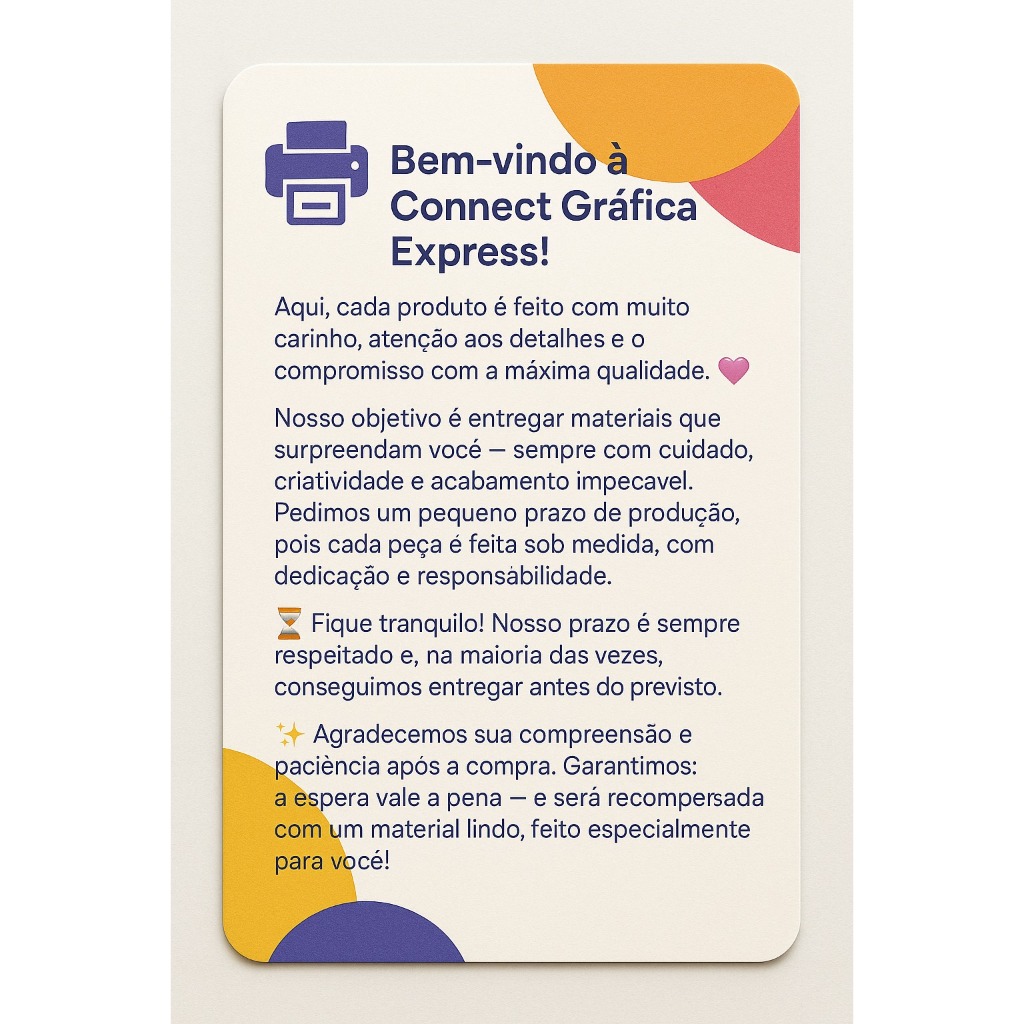 ✨ Tags Personalizadas em Papel Offset Fosco + Laminação Brilho Frente e verso – Qualidade Premium ✨ Destaque sua marca com elegância! Nossas Tags Personalizadas são produzidas com impressão de altíssima qualidade, perfeitas para marcas que buscam transmitir sofisticação, credibilidade e impacto visual. Feitas em Papel Offset Fosco + Laminação Brilho Frente e verso, oferecem resistência, acabamento impecável e cores vivas, garantindo que sua marca seja lembrada em qualquer ocasião. 📌 Detalhes do Produto Material: Papel Offset Fosco + Laminação Brilho Frente e verso Impressão: Colorido Frente e Verso Jato de Tinta Gramatura: 250g Tamanho: 5x5 cm Quantidade mínima: 100 unidades por arte 🎯 IDEAL PARA: ✔ Lembrancinhas ✔ Produtos artesanais ✔ Embalagens personalizadas ✔ Doces e confeitaria ✔ Roupas e acessórios ✔ Brindes e eventos ⚠️ Informações Importantes Não dividimos quantidades entre diferentes artes. É necessário enviar sua arte finalizada em alta resolução (JPG, PNG ou link do Drive). Caso tenha criado no Canva, envie o link desbloqueado. Para impressões frente e verso, envie as duas artes separadas. Não criamos artes, apenas imprimimos o material enviado. Envie sua arte logo após a compra para agilizar a produção. 🎨 Dicas para Melhor Resultado Utilize imagens em alta resolução para evitar perda de qualidade. Prefira cores sólidas e bem definidas para um acabamento fiel. 📢 Atenção sobre Cores Podem ocorrer variações de até 20% nas tonalidades, o que é normal em qualquer processo gráfico. 💡 Garanta agora suas Tags e dê um toque de profissionalismo à sua marca! Agradecemos pela preferência e estamos à disposição para tirar todas as suas dúvidas.