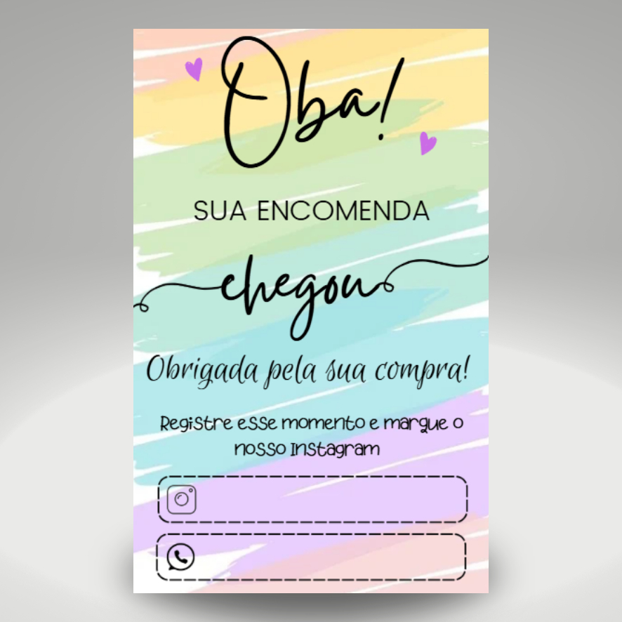Cartões de Agradecimento Personalizados Detalhes de Envio: ### Envie IMEDIATAMENTE via chat o @ da rede social , a loja não ira se responsabilizar em enviar mensagem pedindo . Caso não envie seu pedido será enviado sem ### DESCRIÇÕES DO PRODUTO: -Cartões Personalizados em modelos diversos; -Tamanho 5cm x 8cm Impressos em Papel Fotográfico; - Impressão somente na frente ATENÇÃO: -Prazo para envio de 3 dias -Favor após compra entrar em contato via chat para passar rede social - Não modificamos a arte (Somente incluímos a rede social) SERÁ UM PRAZER TÊ-LO COMO NOSSO CLIENTE, QUALQUER DUVIDA ESTAREMOS À DISPOSIÇÃO PARA ATENDE-LO(A)!!!