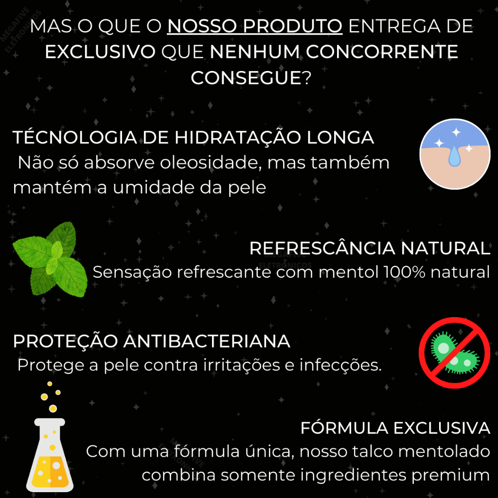Talco Vaxen Ultra Fino – Cabelo, Corte e Pós-Barba O Talco Vaxen Ultra Fino foi desenvolvido especialmente para barbeiros e salões que valorizam acabamento impecável e conforto para seus clientes. Sua fórmula de textura ultrafina garante um toque suave, ajudando a eliminar a oleosidade, o excesso de umidade e proporcionando frescor imediato após cortes de cabelo ou barba. Por que escolher o Talco Vaxen Ultra Fino? * Textura extra suave – desliza facilmente sobre a pele e os fios. * Controle de oleosidade – mantém a pele seca e confortável. * Frescor prolongado – sensação de limpeza e leveza após o uso. * Uso multifuncional – ideal para pós-barba, cortes de cabelo e controle do suor. * Alto rendimento – basta uma pequena quantidade para excelente resultado. Como usar: 1. Após o corte de cabelo ou barbear, certifique-se de que a área esteja limpa e seca. 2. Aplique uma pequena quantidade de Talco Vaxen Ultra Fino sobre as mãos ou diretamente na pele. 3. Espalhe de forma uniforme, removendo o excesso com auxílio de uma escova ou toalha. Segurança e cuidados: * Uso externo. * Evite inalar o produto. * Mantenha fora do alcance de crianças. Resumo dos benefícios: * Toque suave e confortável para pele e cabelos. * Reduz oleosidade e umidade. * Sensação imediata de frescor e limpeza. * Ideal para uso profissional em barbearias e salões. * Rendimento excelente com aplicação econômica. Talco Vaxen Ultra Fino – o toque final perfeito para cortes e barbearias que prezam por qualidade e bem-estar do cliente.