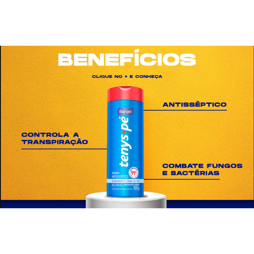 O Talco Desodorante Tenys Pé Baruel mantém seus pés protegidos e perfumados livre de odores por muito mais tempo como você sempre quis. Os pés precisam de um cuidado mais que especial por isso a linha Tenys Pé Baruel se dedica exclusivamente em proporcionar total proteção e refrescância aos seus pés todos os dias mantendo-os perfumados e sequinhos. O Talco Desodorante Tenys Pé Baruel Original possui aroma suave e controla a transpiração excessiva durante todo o dia. Seu formato em pó inibe sudorese intensiva mantendo os pés secos durante todo o dia. Uso exclusivo somente para os pés.
