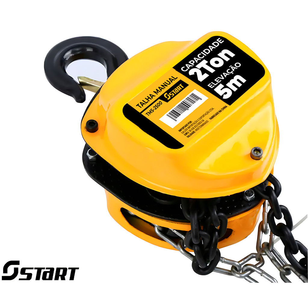 TALHA MANUAL 2 TONELADAS 2000 KG COM CORRENTE ELEVAÇÃO 5 METROS COM FREIO DUPLO TS2500 Start DESCRIÇÃO: A Talha Manual START de 2 toneladas com elevação de 5 metros é uma ferramenta robusta e confiável, ideal para elevação e movimentação de cargas pesadas com segurança e facilidade. Projetada para uso em ambientes industriais, oficinas e construção civil, oferece desempenho durável e operação simples. VANTAGENS: - Ideal para uso em ambientes industriais e de construção; - Acabamento: Pintura eletrostática resistente à corrosão; - Sistema de freio manual para segurança na operação; - Material da corrente: Aço de alta resistência; - Capacidade máxima de carga: 2 toneladas. APLICAÇÕES: - Operação manual prática e segura para controle preciso da carga; - Ideal para elevação e movimentação de cargas até 2 toneladas; - Uso em indústrias, oficinas, canteiros de obra e manutenção. ESPECIFICAÇÕES TÉCNICAS: - Acabamento: Pintura eletrostática resistente a corrosão; - Material da corrente: Aço de alta resistência; - Capacidade máxima de carga: 2 toneladas; - Altura máxima de elevação: 5 metros; - Sistema de freio: Manual; - Modelo: TS2500. CONTEÚDO DA EMBALAGEM: - 01 Corrente de aço com 5 metros de elevação; - 01 Manual de instruções e segurança; - 01 Talha Manual START 2 Toneladas; - 01 Gancho de fixação reforçado. MARCA & MODELO: - Marca: START - Modelo: TS2500